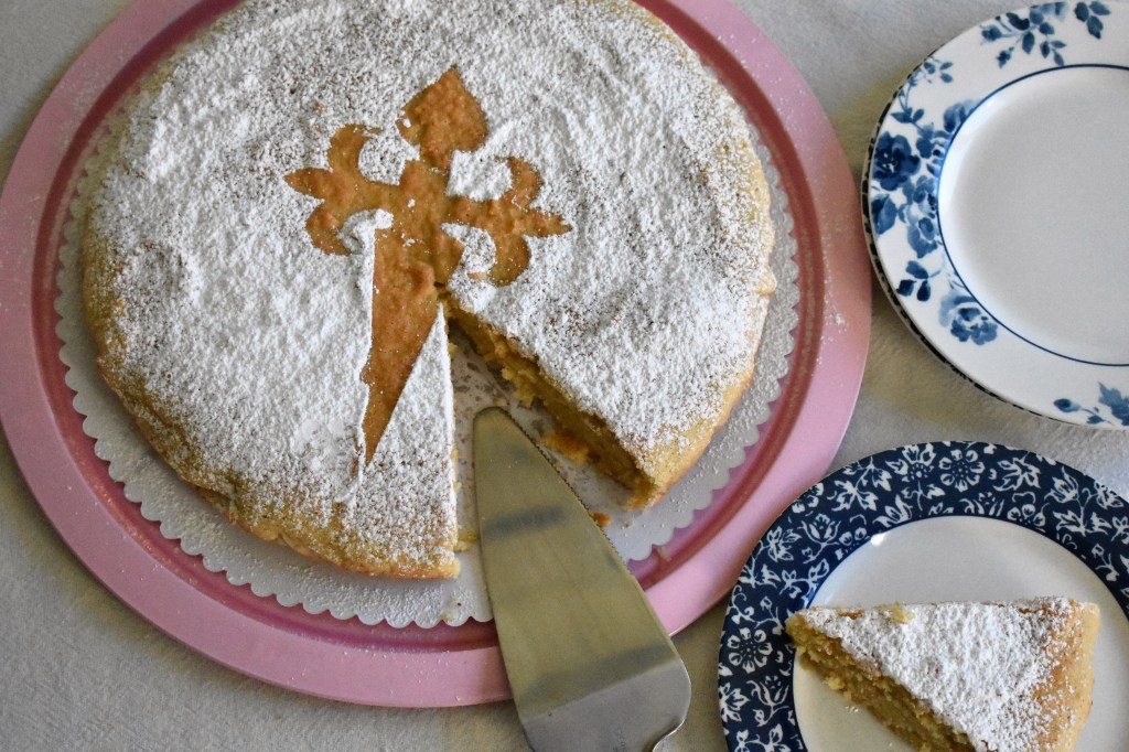 - Hacemos una plantilla en forma de cruz y una vez fría la tarta, colocamos la plantilla sobre la ella y espolvoreamos de azúcar glas con ayuda de un colador. Retiramos con mucho cuidado la plantilla.