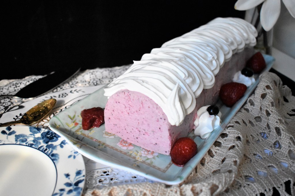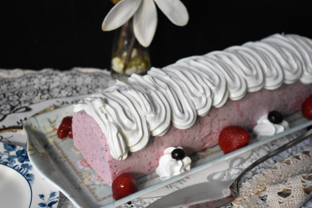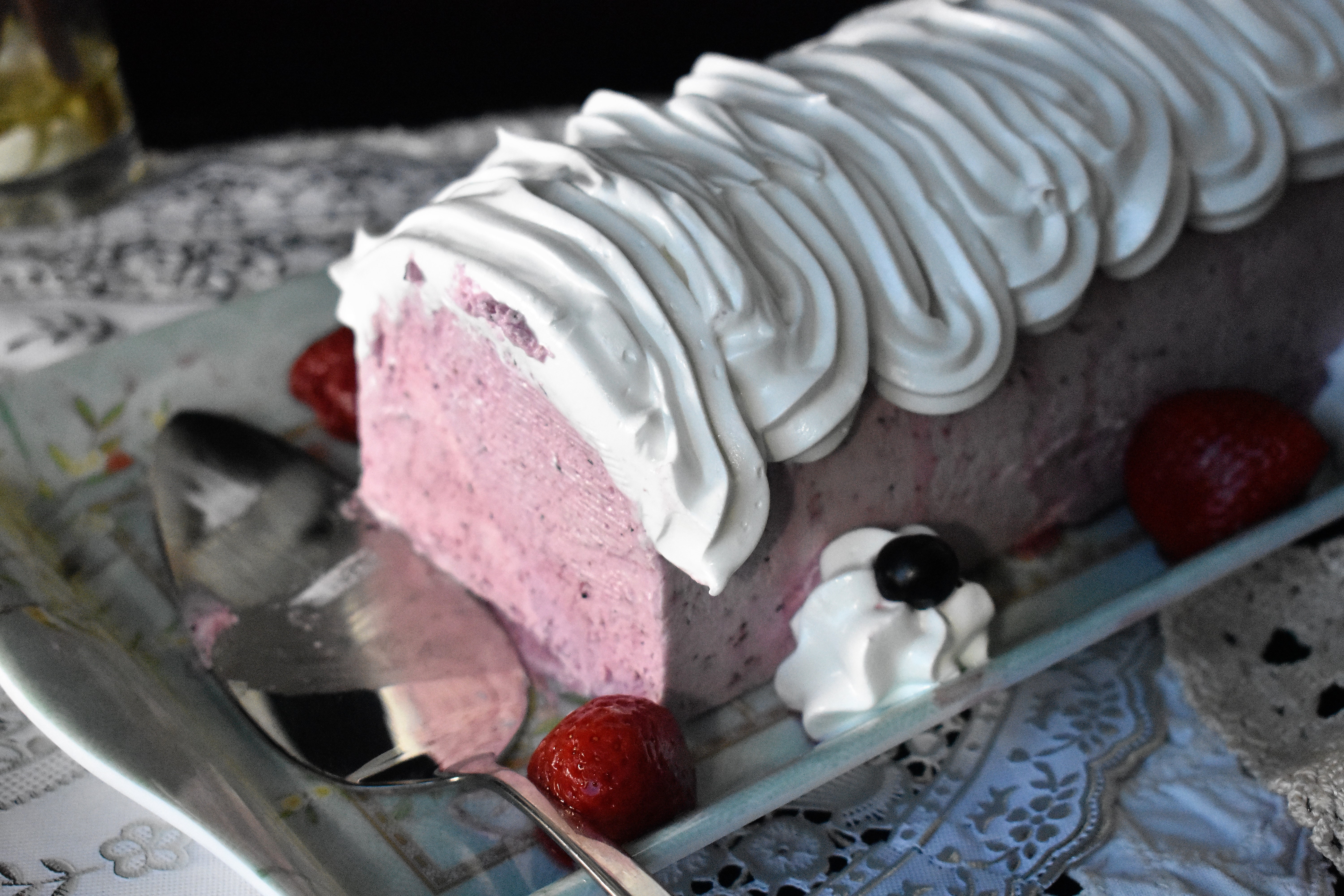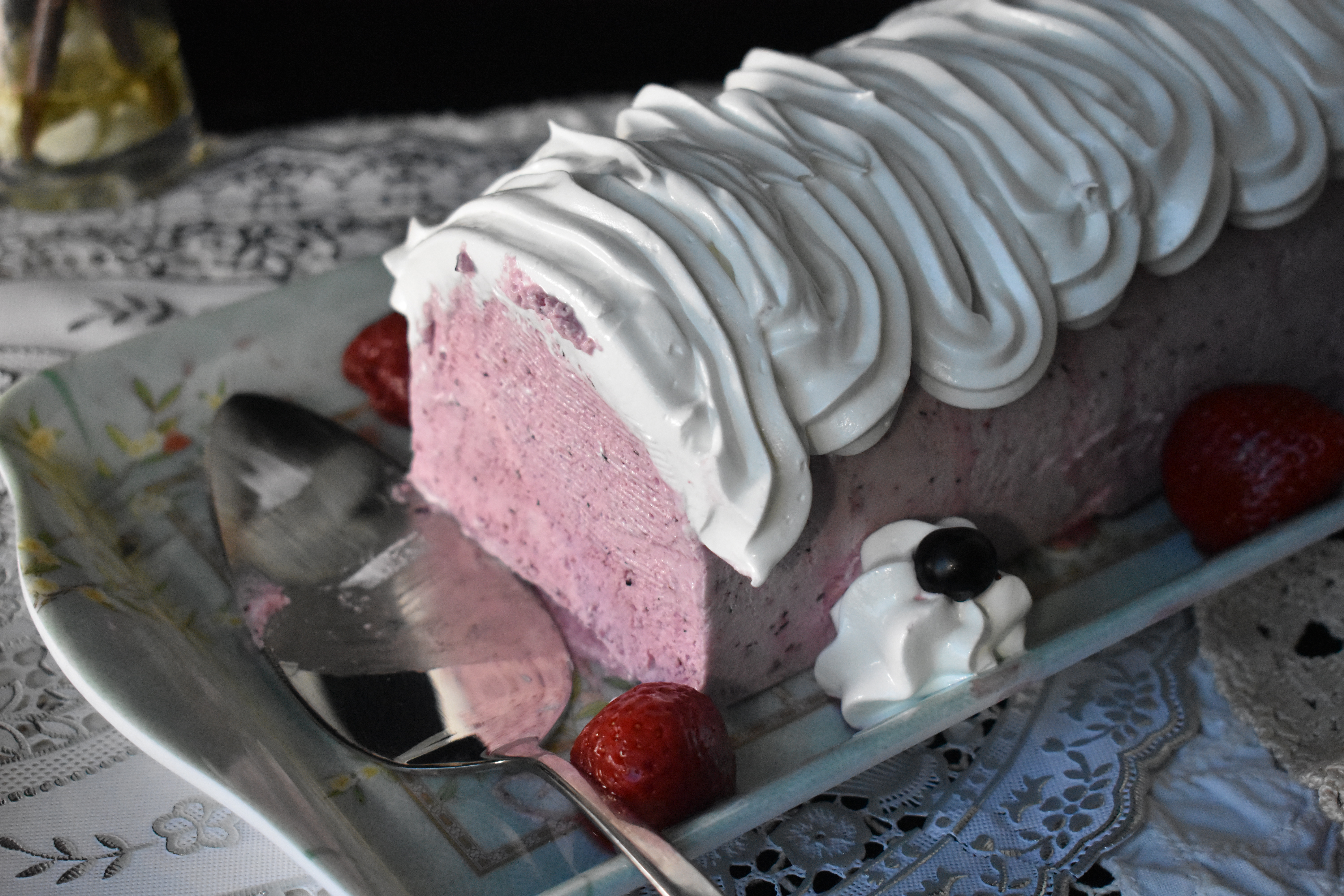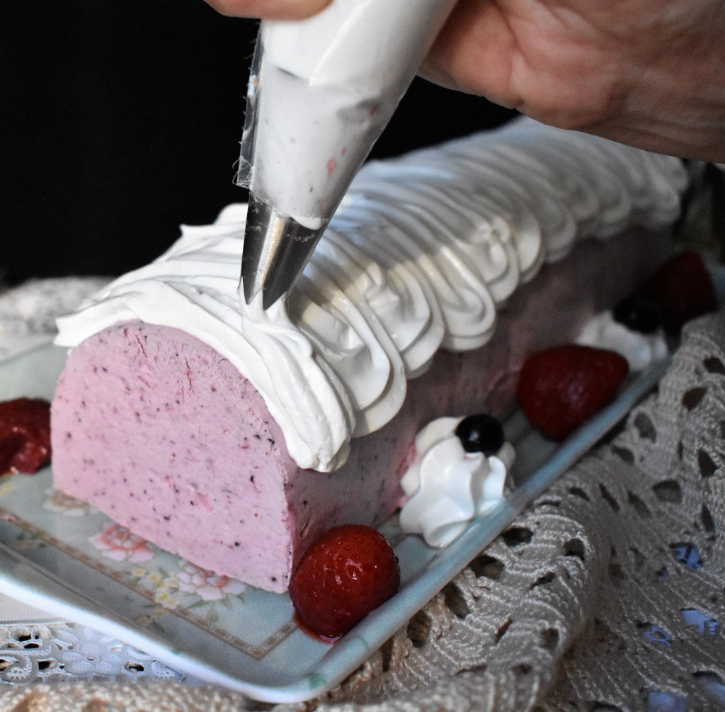 En Navidad no siempre apetece el típico tronco con chocolate, crema de turrón y crema. A veces, y sobre todo por el sur, apetece algo fresquito para el postre. Y por acá por el norte también. Así que te propongo este tronco semifrío de Navidad. La forma la obtuve gracias al molde media caña de acero inoxidable de Buyer, de la tienda de Claudia and Julia. Pero tu puedes hacerlo incluso con una botella de plástico lisa, cortándola por la mitad.