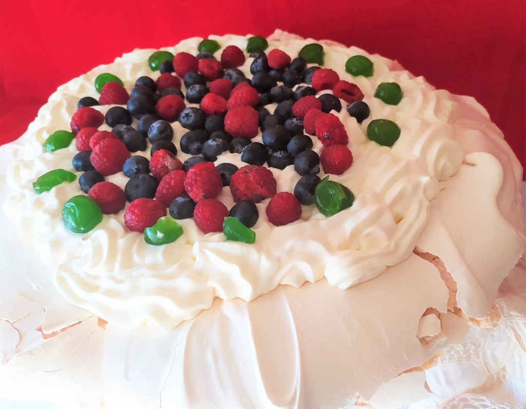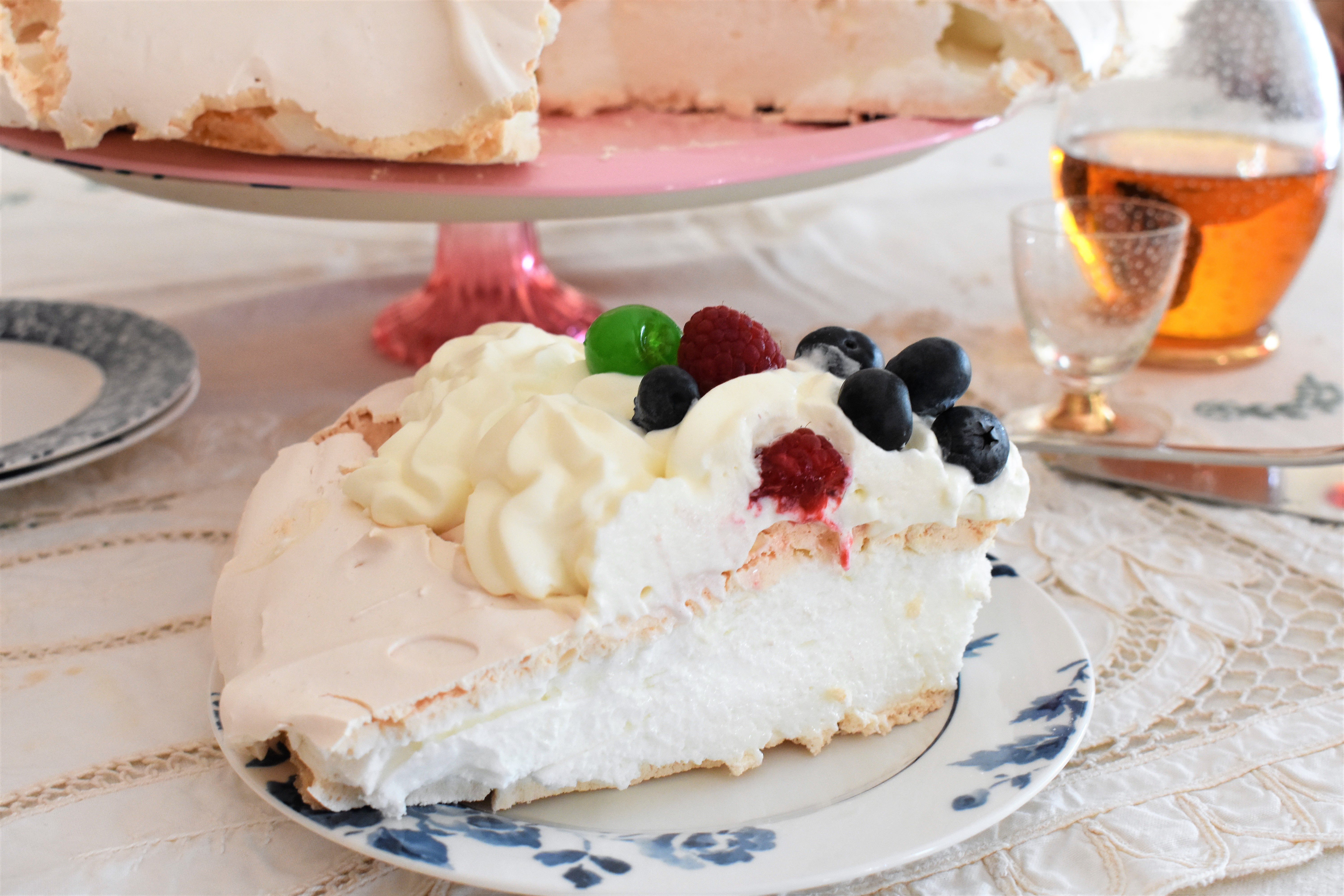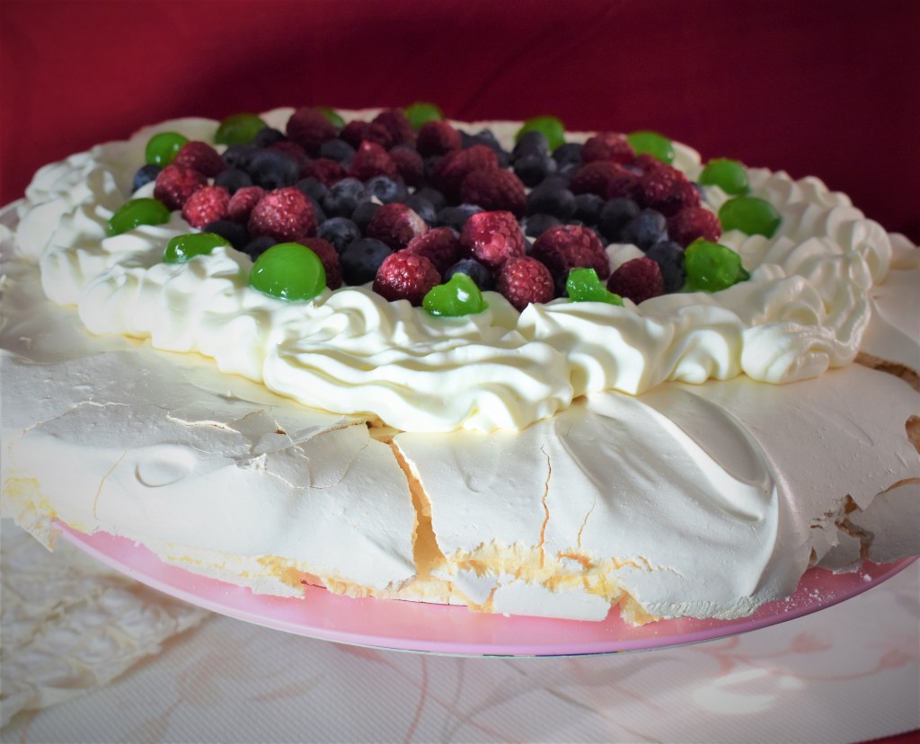 Esta tarta llamada así en honor a la famosa bailarina rusa Anna Pavlova. Dicen que la bailarina visitó Nueva Zelanda y en su honor surgió este postre, homenajeándola con su nombre. Aunque los australianos también se disputan su autoría. Es una tarta con base de merengue, crujiente por fuera y cremosa por dentro. Que se adorna con frutos, especialmente rojos. El único secreto es el merengue, un merengue francés, bien batido. La base se prepara con antelación, pero la nata y los frutos se agregan en el momento de servir para que no se desmorone. Se puede hacer en capas, yo he optado por una base grande, ya que era un postre para compartir entre muchas personas.