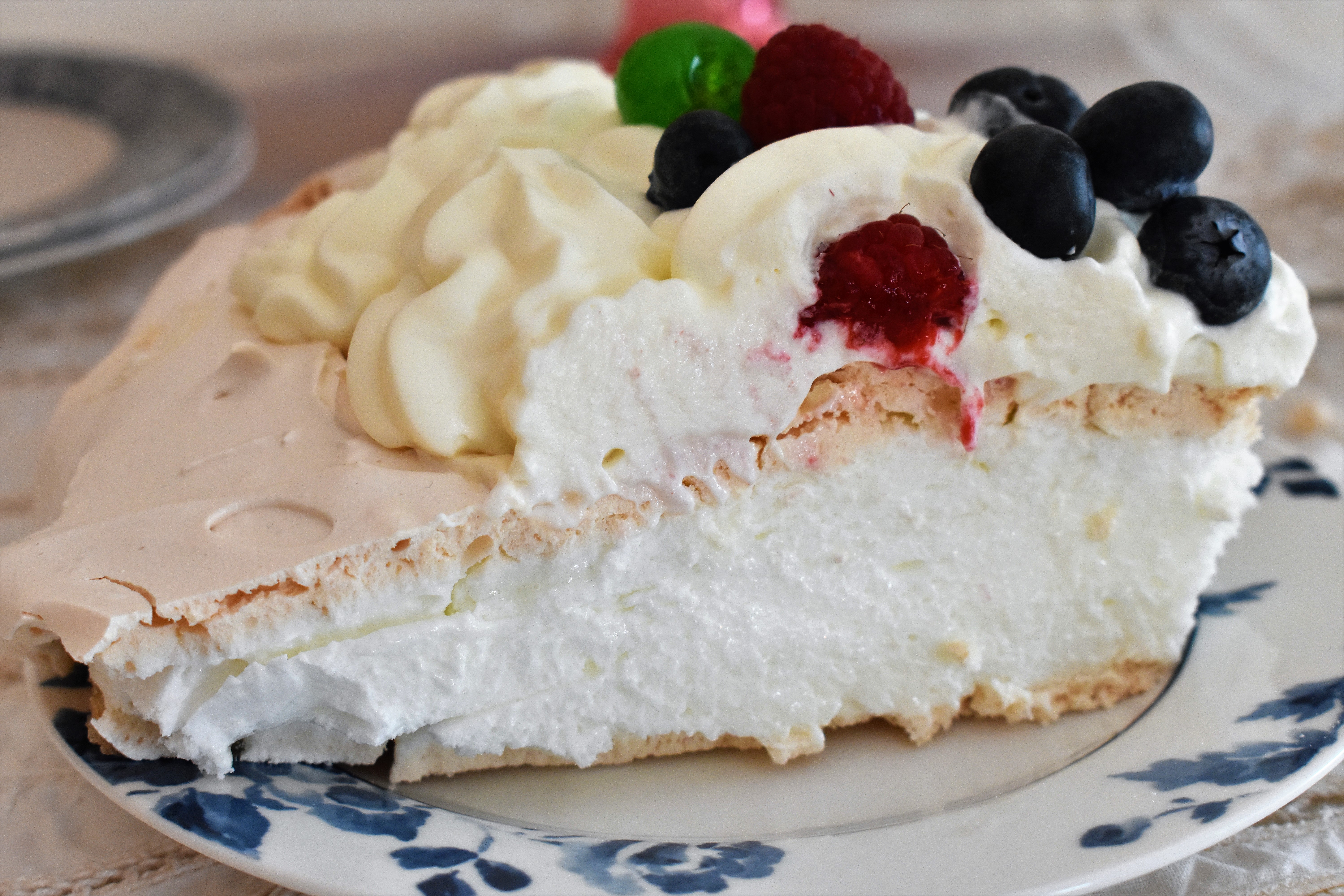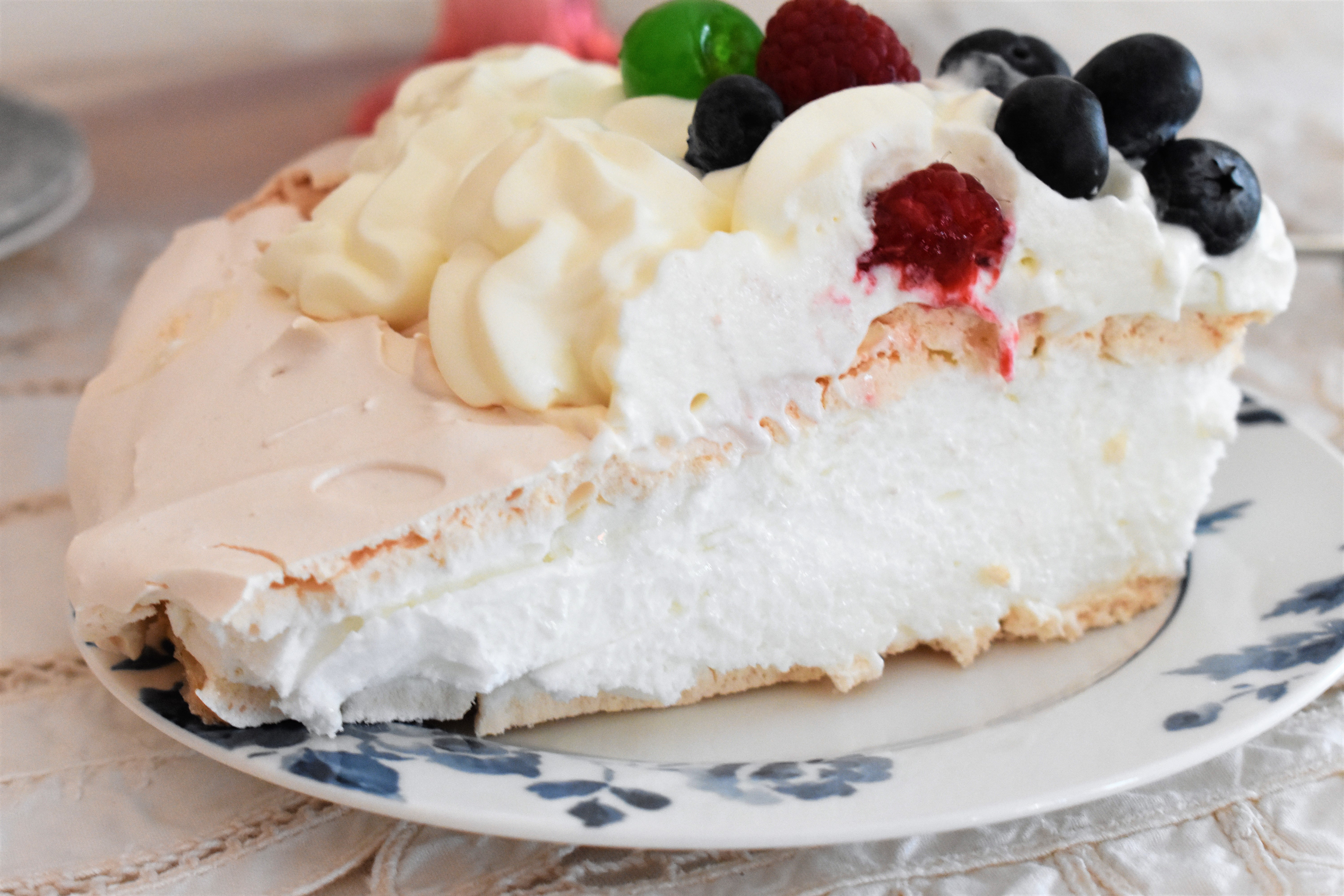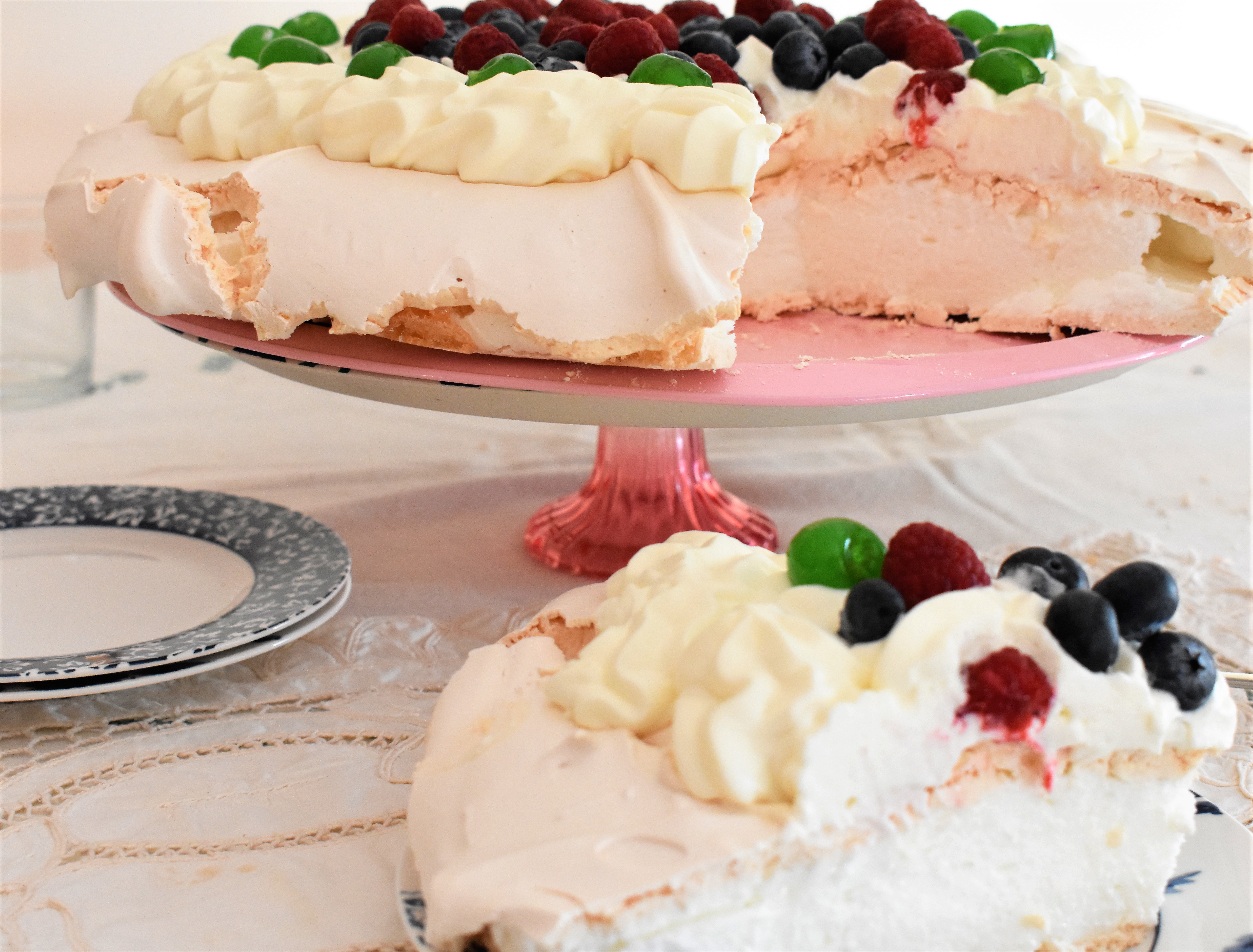 Esta tarta llamada así en honor a la famosa bailarina rusa Anna Pavlova. Dicen que la bailarina visitó Nueva Zelanda y en su honor surgió este postre, homenajeándola con su nombre. Aunque los australianos también se disputan su autoría. Es una tarta con base de merengue, crujiente por fuera y cremosa por dentro. Que se adorna con frutos, especialmente rojos. El único secreto es el merengue, un merengue francés, bien batido. La base se prepara con antelación, pero la nata y los frutos se agregan en el momento de servir para que no se desmorone. Se puede hacer en capas, yo he optado por una base grande, ya que era un postre para compartir entre muchas personas.