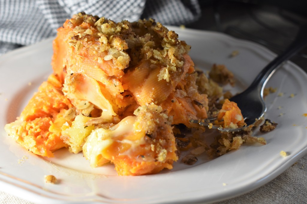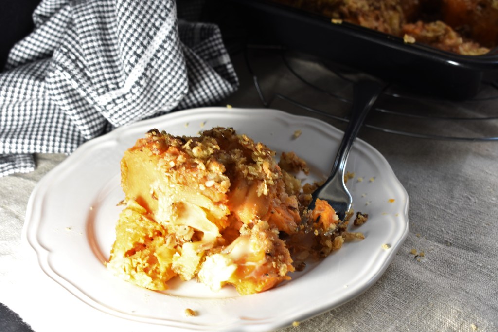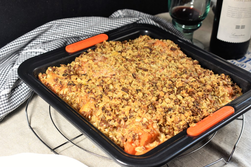 - Desmigamos la mezcla por encima de los boniatos y el queso. Llevamos al horno a 190º, calor arriba y abajo, hasta que esté doradito el crocante.