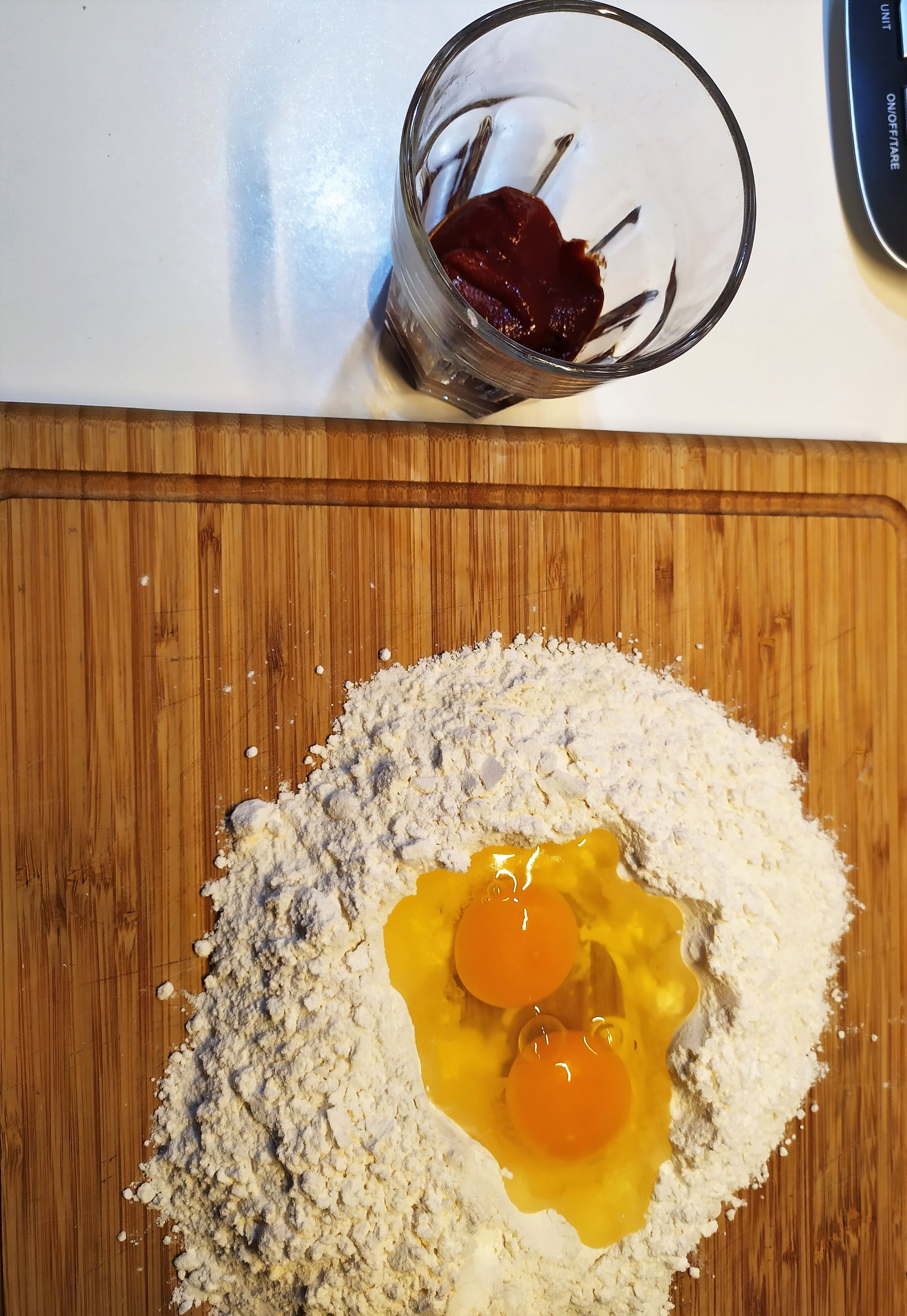 - Colocamos la harina sobre la mesa de trabajo, hacemos con la mano un hueco en el centro y obtenemos el volcán en el que rompemos 2 huevos y agregamos el concentrado de tomate.