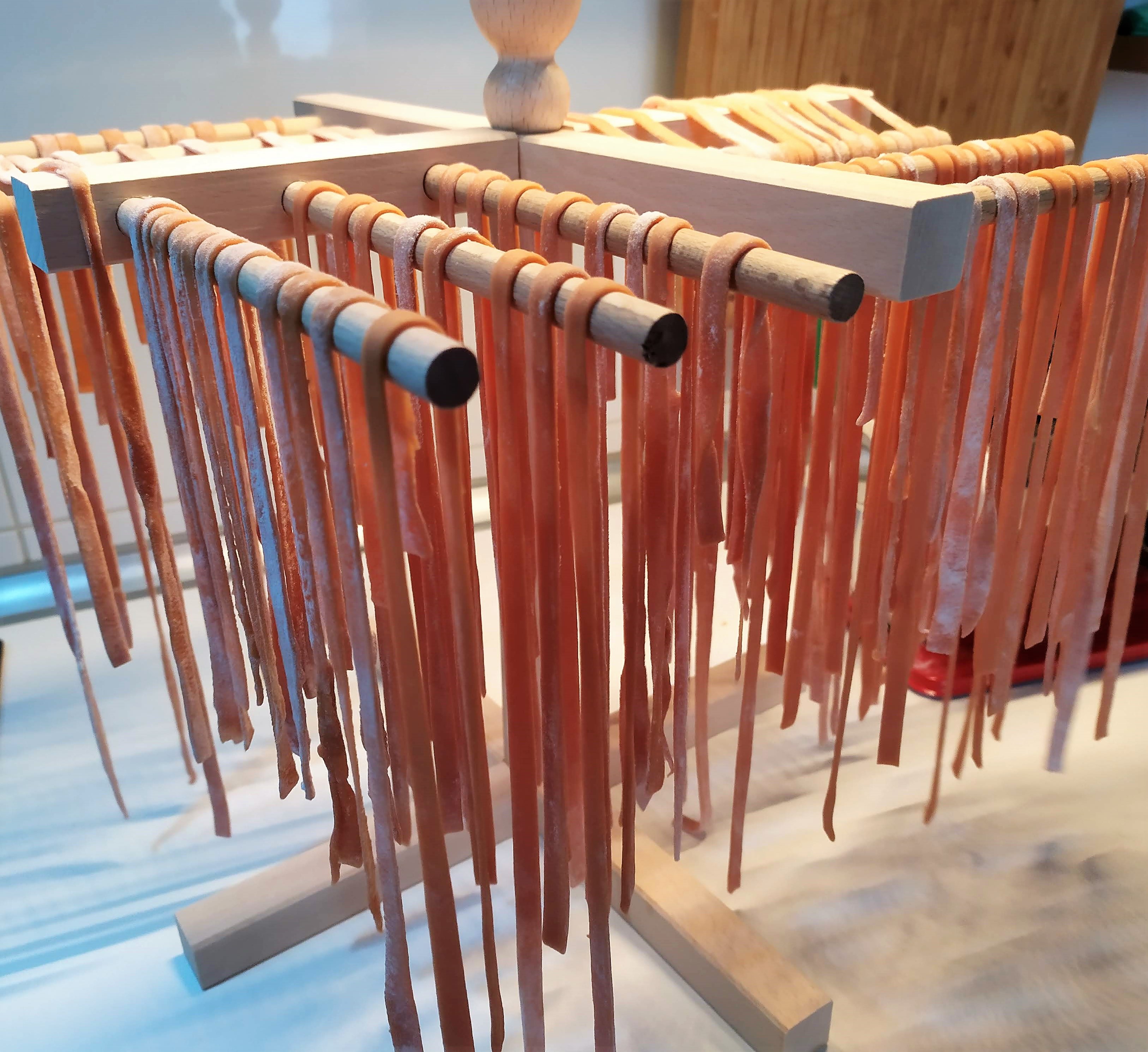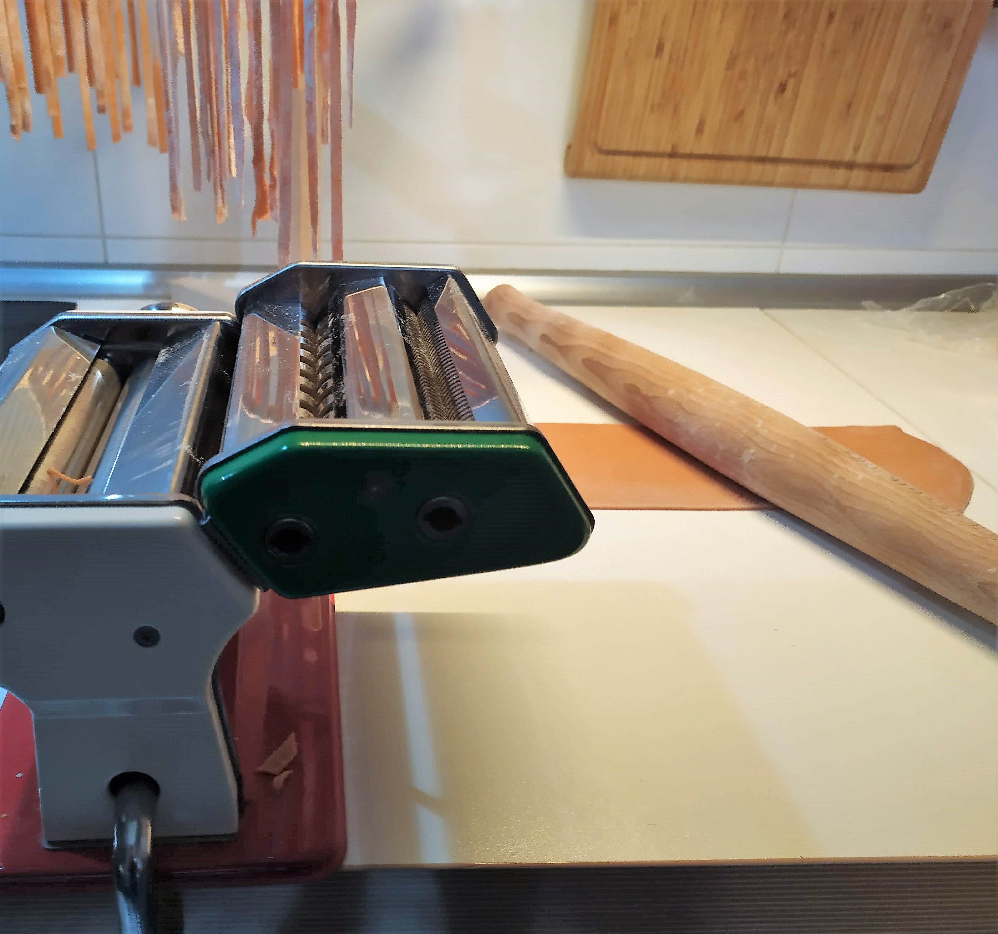 - Espolvoreamos con harina una superficie lisa (encimera o tabla de amasar) y estiramos la masa (con la máquina o con un rodillo) hasta que esté bien fina. Cortamos los tallarines (con maquina o cuchillo) y dejamos secar. ( Ver puntos 7, 8, 9 y 10 del Modo Tradicional).