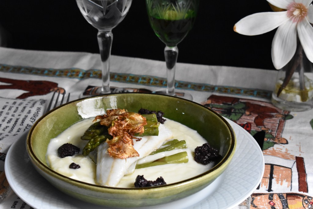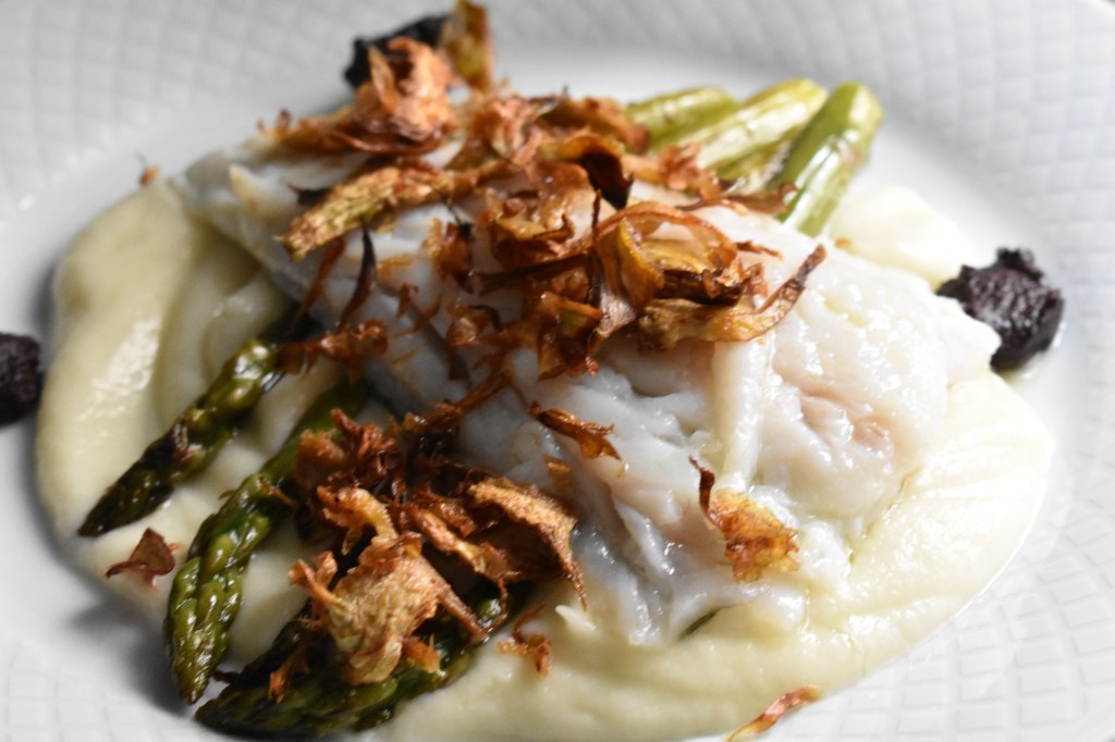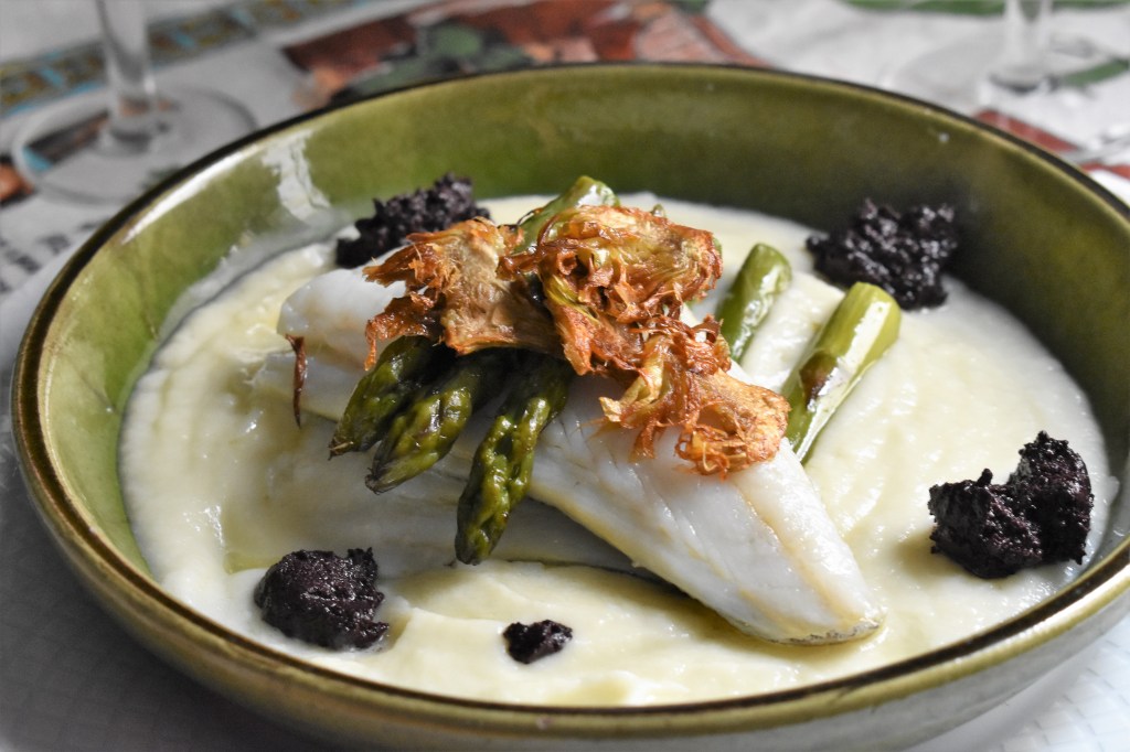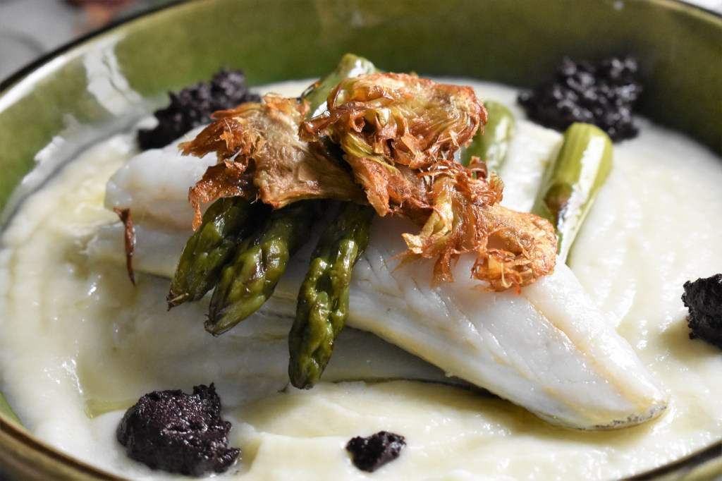 - Emplatamos, poniendo un poco de puré de coliflor, los espárragos y el bacalao dando altura al plato y terminamos con las chips de alcachofas y unas cucharaditas de olivada para dar contraste al puré.