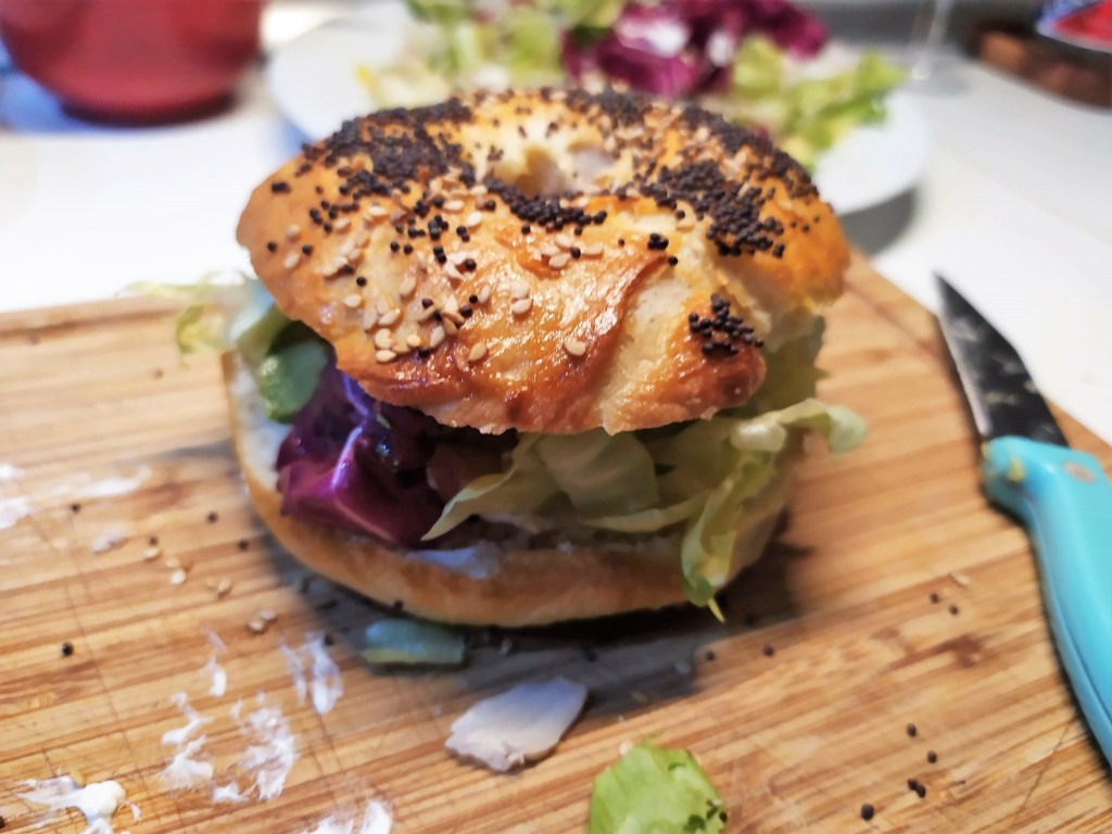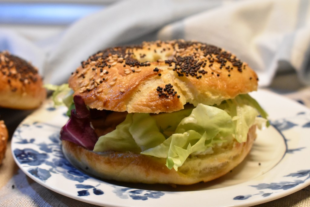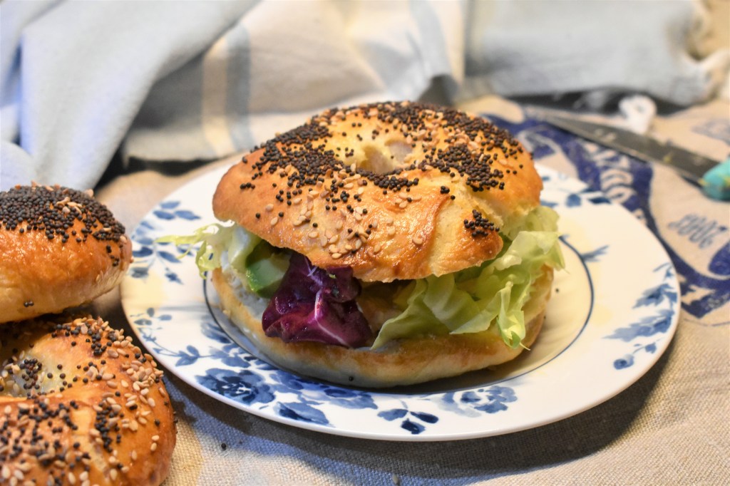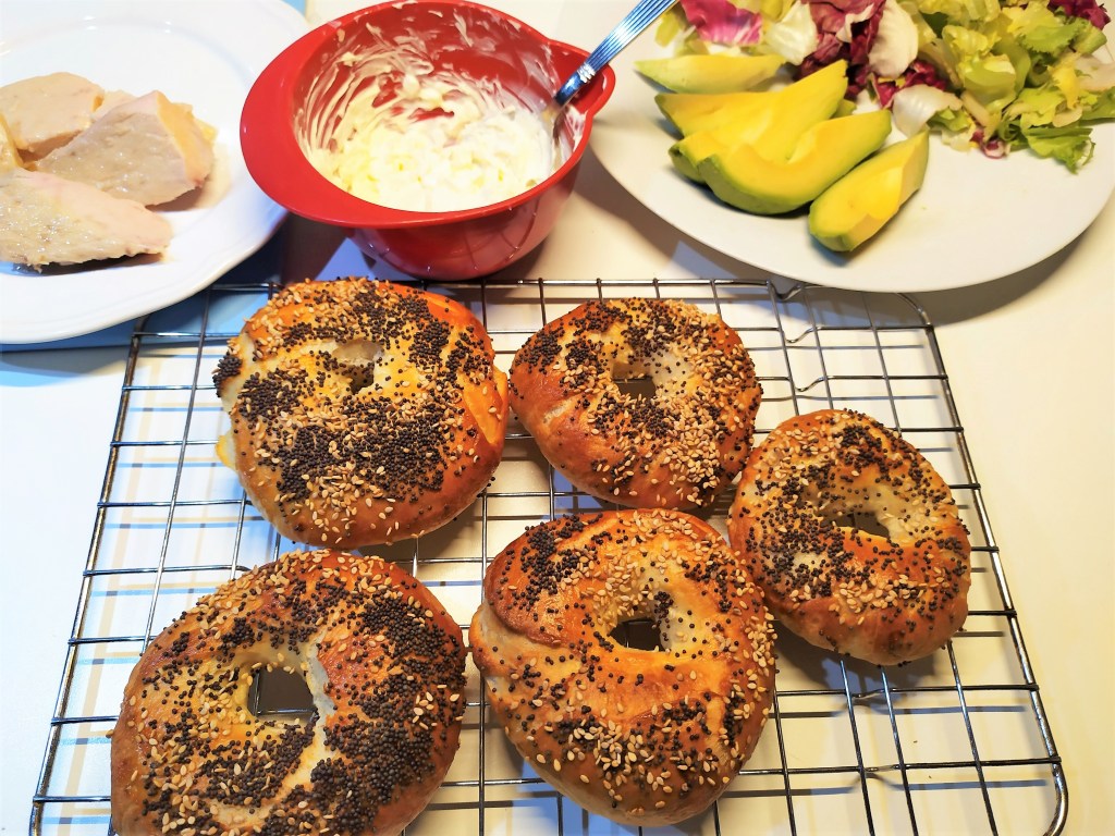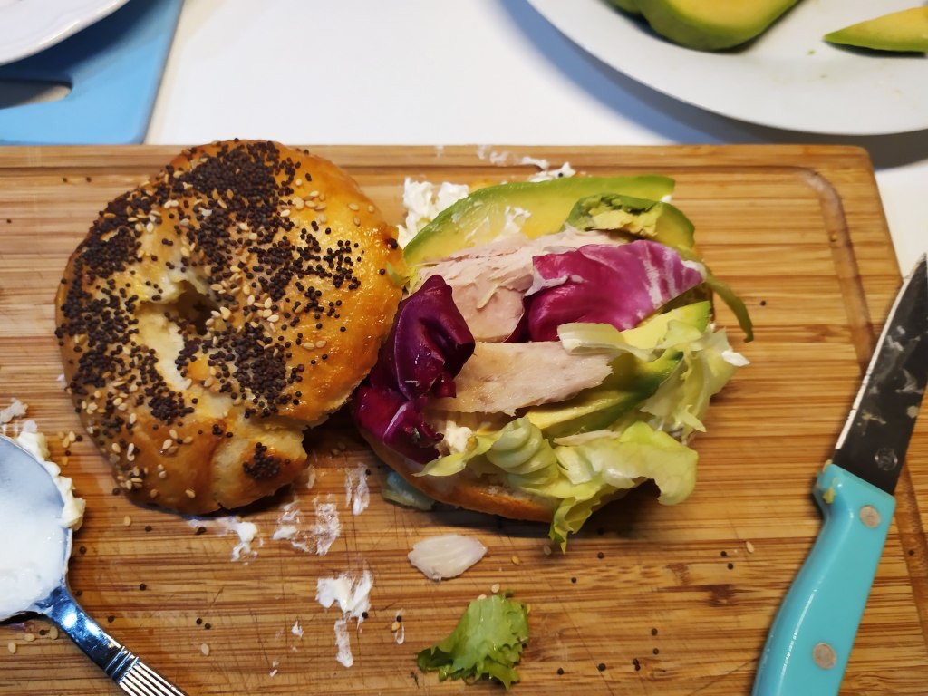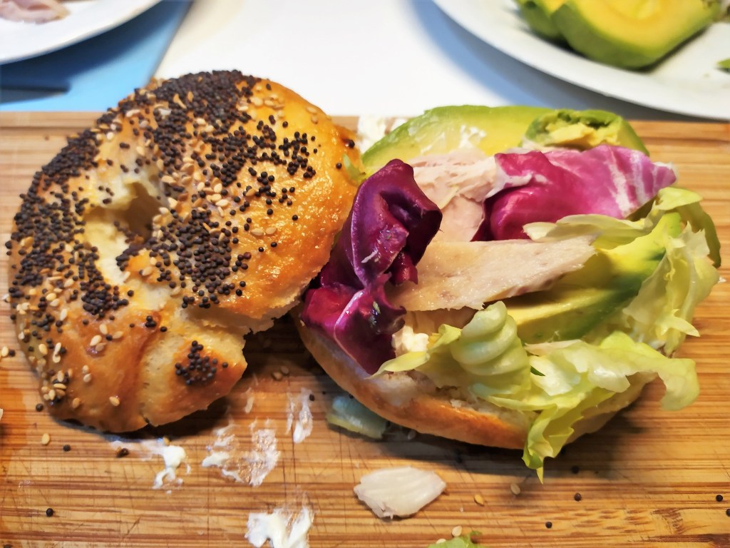 El bagel es un pan de harina de trigo que suele tener un agujero en el centro. Antes de ser horneado se cocina en agua brevemente, dando como resultado un pan denso con una cubierta exterior ligeramente crujiente. Muy característico de los desayunos americanos, esta receta la puedes tunear a tu gusto y convertir en una merienda o cena informal. Aunque los bagels son originarios de Polonia, la migración de europeos, sobre todo judíos, llevó a popularizar este alimento en Estados Unidos, donde se suelen servir rellenos de queso crema y salmón. En mi caso te ofrezco una versión de vegetales con bonito, queso y aguacate.