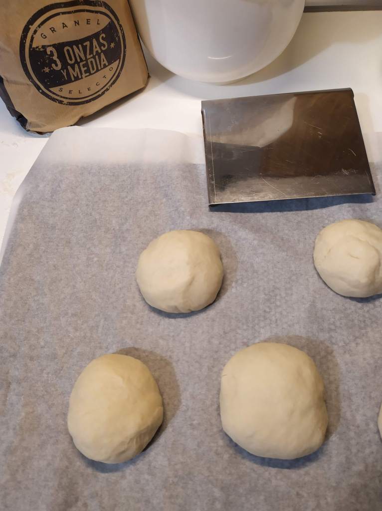 - Formamos una bolita con cada porción y las colocamos con suficiente espacio entre ellas (crecen bastante) sobre una bandeja con papel de horno. Dejamos que fermenten de nuevo hasta que se inflen un poco (20 minutos aproximadamente).