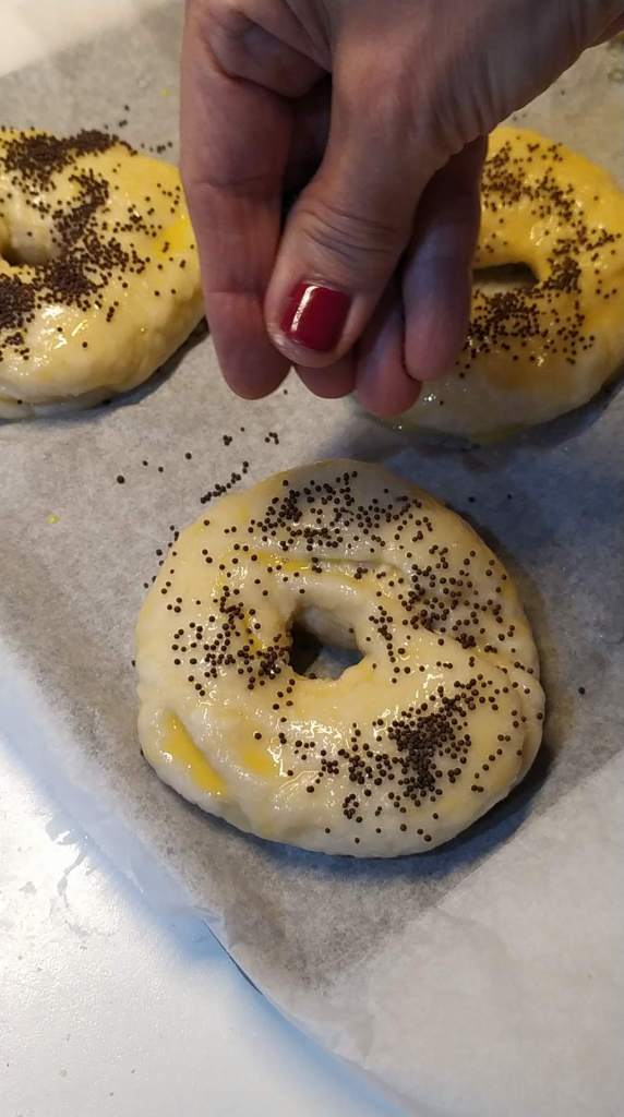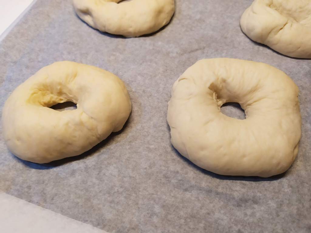 - Vamos colocando los bagels sobre una bandeja con papel de horno. Es importante colocar los bagels en la bandeja de forma que no se toquen y quede espacio entre ellos. En éste caso usaremos 2.