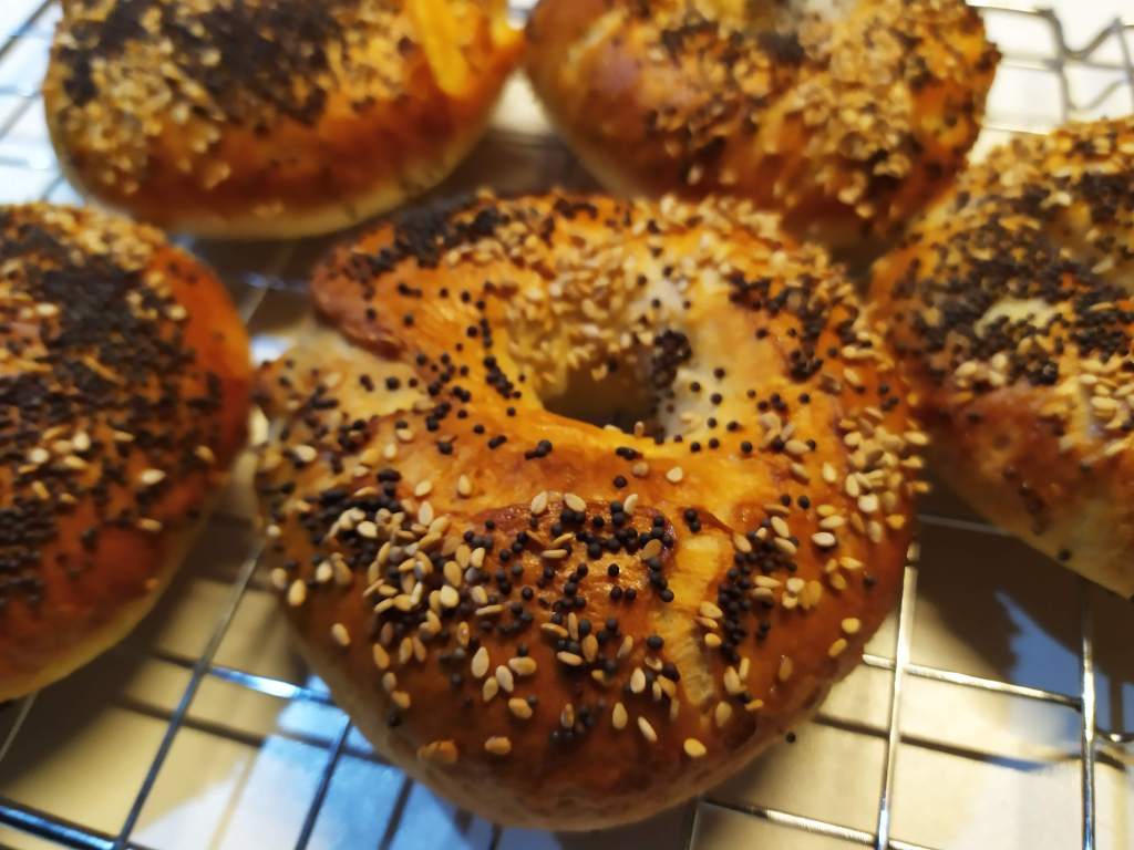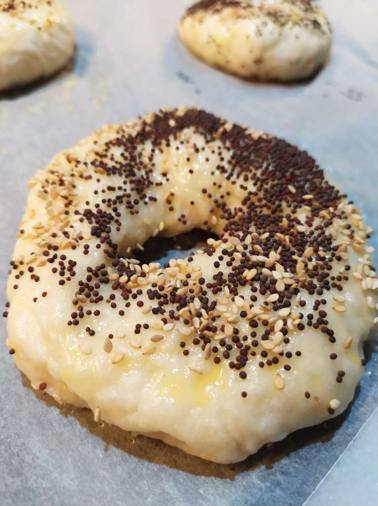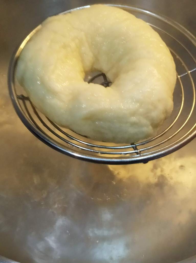 - Ponemos una cazuela con agua al fuego y cuando empiece a hervir agregamos 3-4 bagels (según el tamaño de la cazuela). Escaldamos durante unos 20 segundos de cada lado.