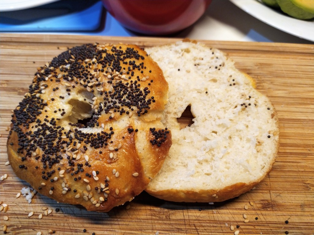 - Cortamos los bagels a la mitad con un cuchillo de sierra.