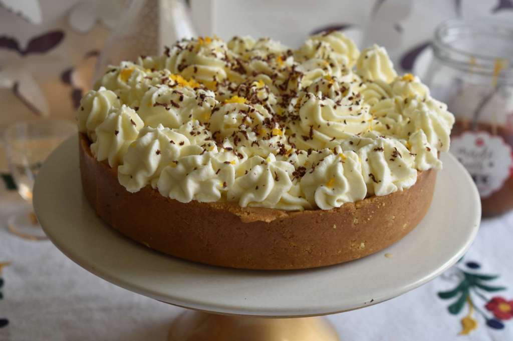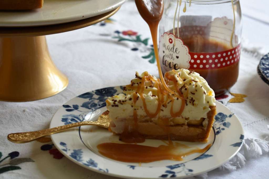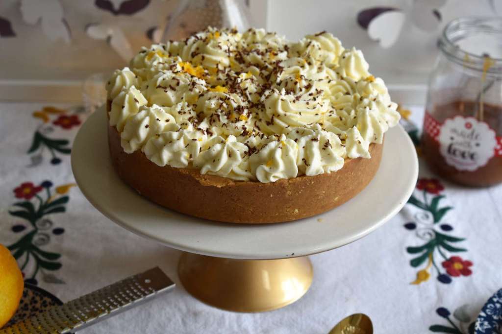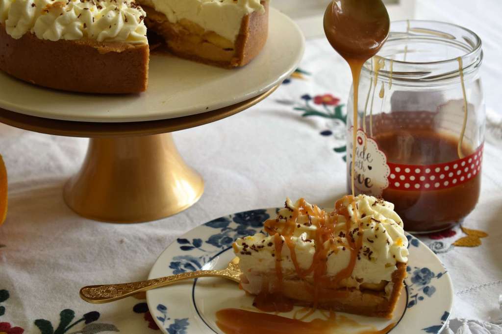 - Montamos la tarta poniendo sobre la base de galletas y crema de caramelo los plátanos marinados, encima el chantilly y decoramos con piel de naranja y chocolate rallado.