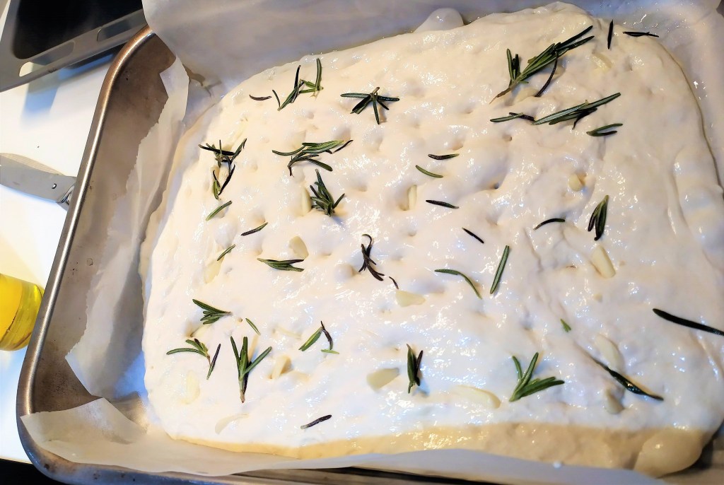- Mezclamos aceite ajo y romero, pincelamos la masa y desgasificamos suavemente con los dedos, solo un poco, como si quisiéramos que el aceite penetre un poco en ella pero sin apretar demasiado.