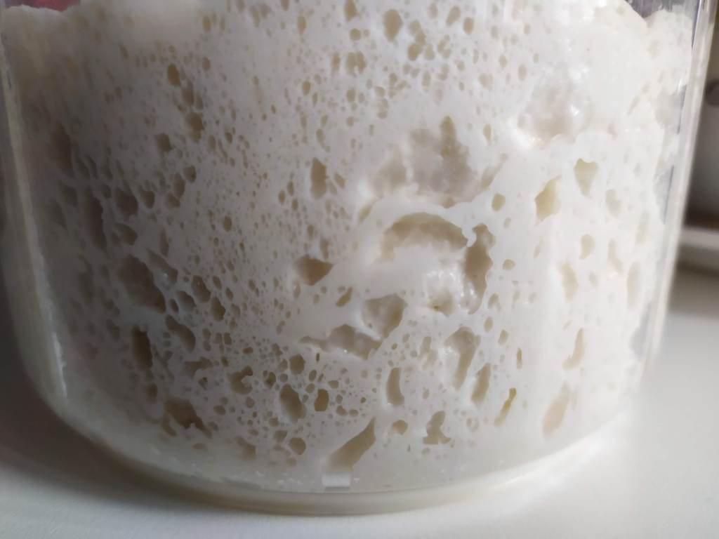 - En un bol grande ponemos aproximadamente la mitad del agua y añadimos la masa madre bien activa ( varios refrescos antes de usarla, que esté bien burbujeante). Removemos hasta que se disuelve completamente.