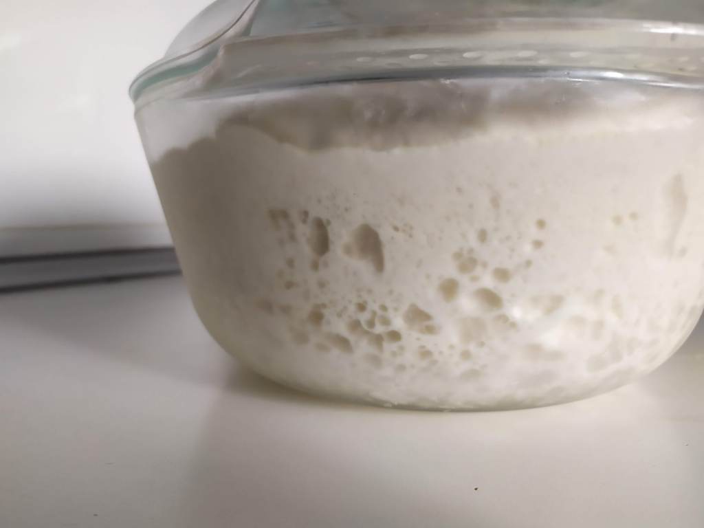- Después de una hora y media de plegados y reposos, a una temperatura de unos 25º aproximadamente, cuando vemos que ha duplicado su tamaño la llevamos a la nevera para que siga fermentando lentamente durante 24 horas.