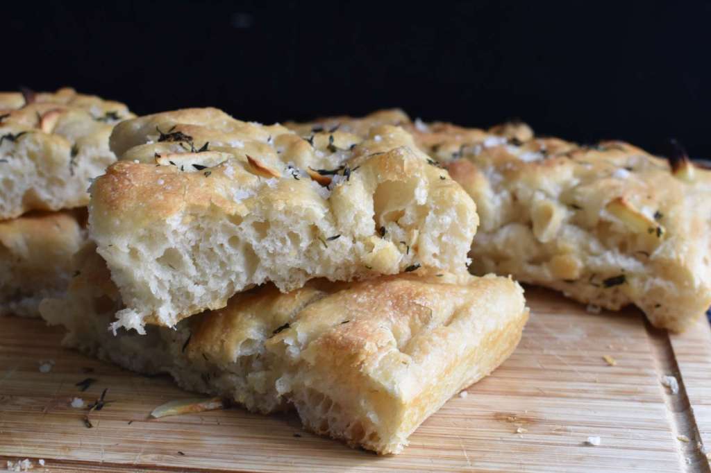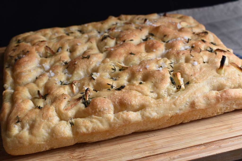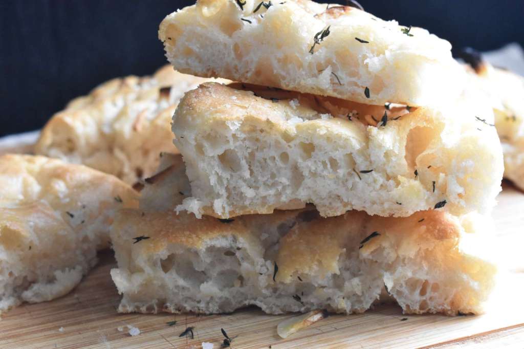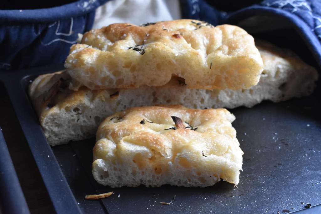 Aunque el precio de la luz está por las nubes y hornear no es muy barato, con paciencia y esperando las horas más económicas de fines de semana, siempre te saldrá más sano y económico hacer una focaccia en casa para disfrutar con familia o amigos. Hoy traigo esta propuesta de focaccia con masa madre. Si no tienes siempre puedes usar levadura. La masa madre gracias a la fermentación natural siempre favorecerá tu digestión a la vez que contiene menos filatos que favorecen la absorción de minerales y menos índice glucémico. Y a la vez que aprender a cuidarla es un proceso muy gratificante. Yo uso MM al 60 % de hidratación ( 60 de agua por 100 de harina), por lo que si tienes Mm al 100 % debes disminuir un poquito la cantidad de agua. También decirte que la cantidad de agua depende de las harinas y de la humedad del ambiente. Yo uso harinas del Amasadero, mezclando harina de fuerza con otra de fuerza media o panadera.