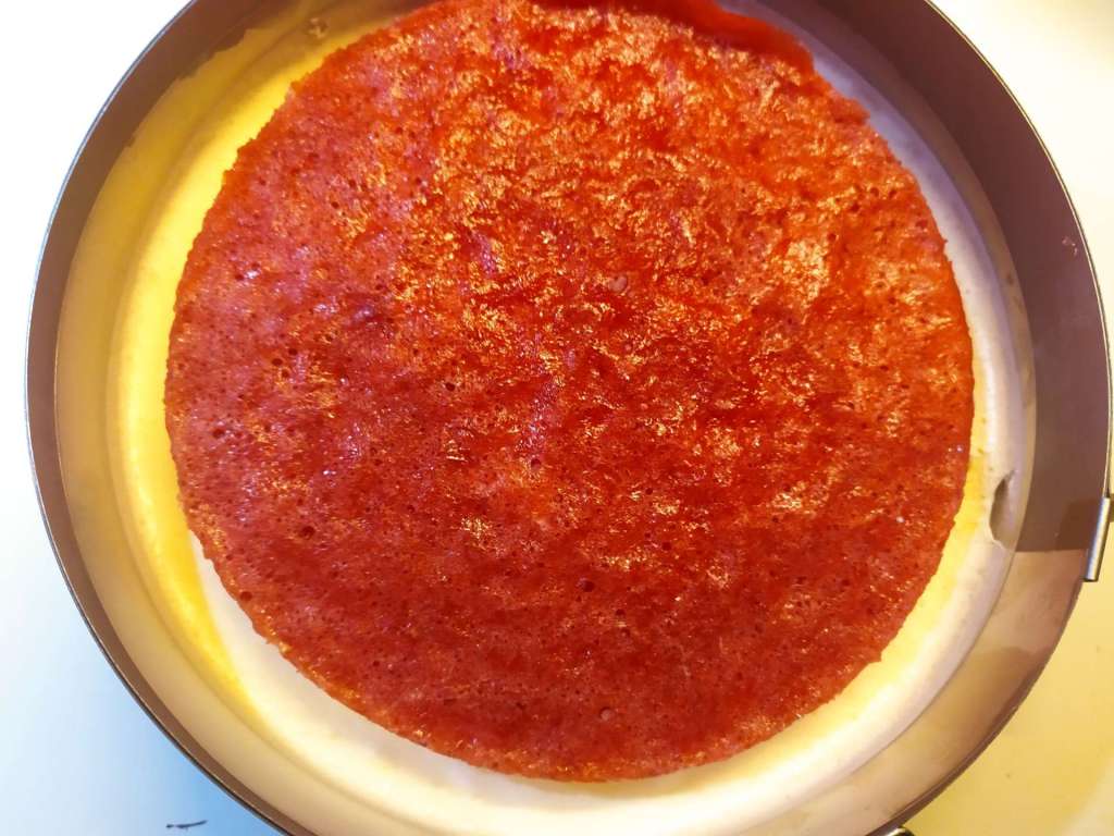 - Una vez pasado el tiempo colocamos el disco centrado de interior de fresas y recubrimos con el resto de mousse de queso. Alisamos con una espátula la superficie.