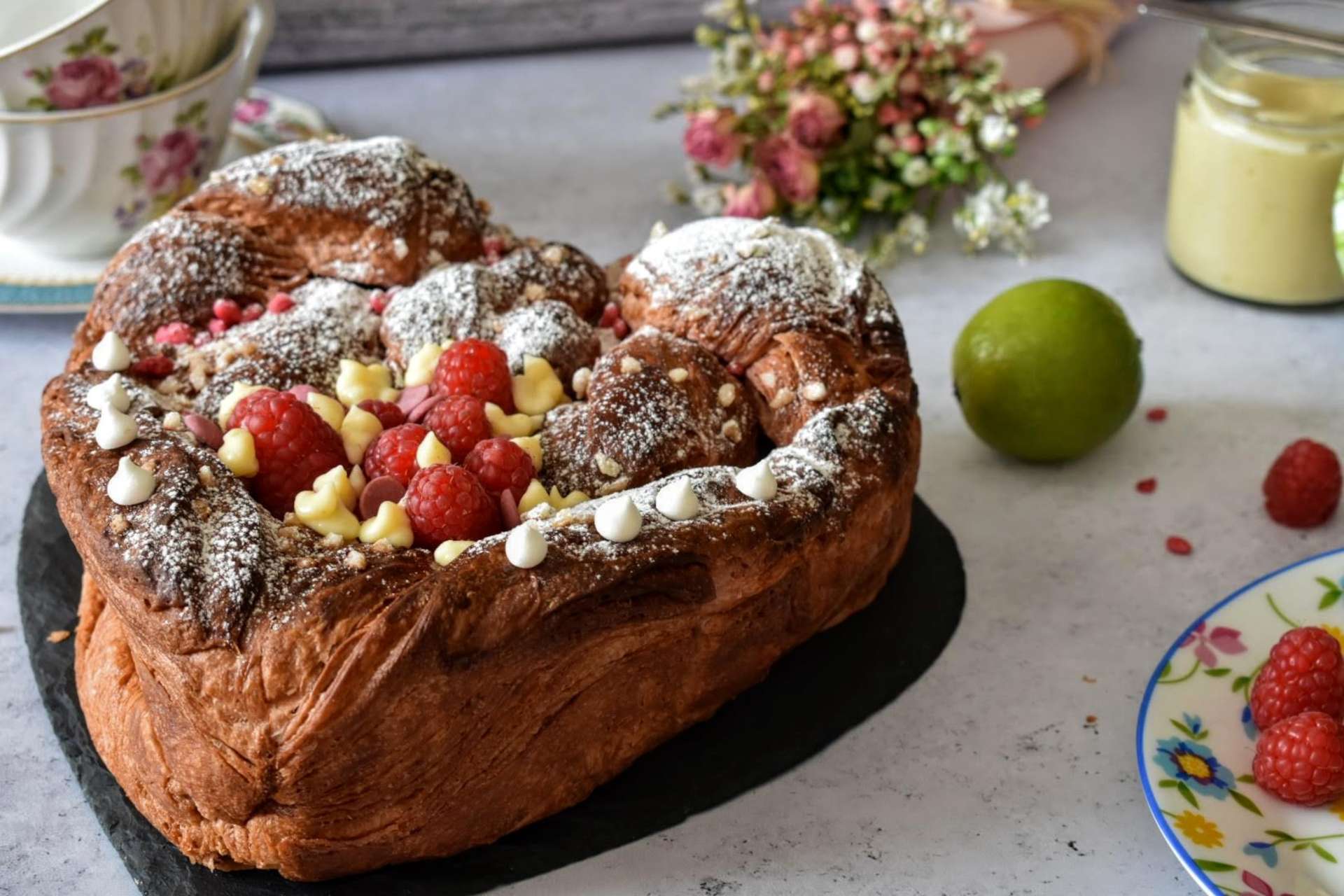 Me animé con este brioche, y aunque hay mucho que mejorar, os cuento la receta, que adapté de varios autores. Principalmente del blog maravilloso de Bake Street. Evidentemente mi resultado no está a la altura de esas manos tan expertas. Pero me animé a hacer variaciones, y el resultado nos encantó. Prometí repetirlo, y mejorar. Mi idea fue añadir las frambuesas a la masa, y darle ese color rojizo y ese aroma a cítricos tan rico. Te cuento como lo hice. Usé masa madre, pero puedes usar levadura.