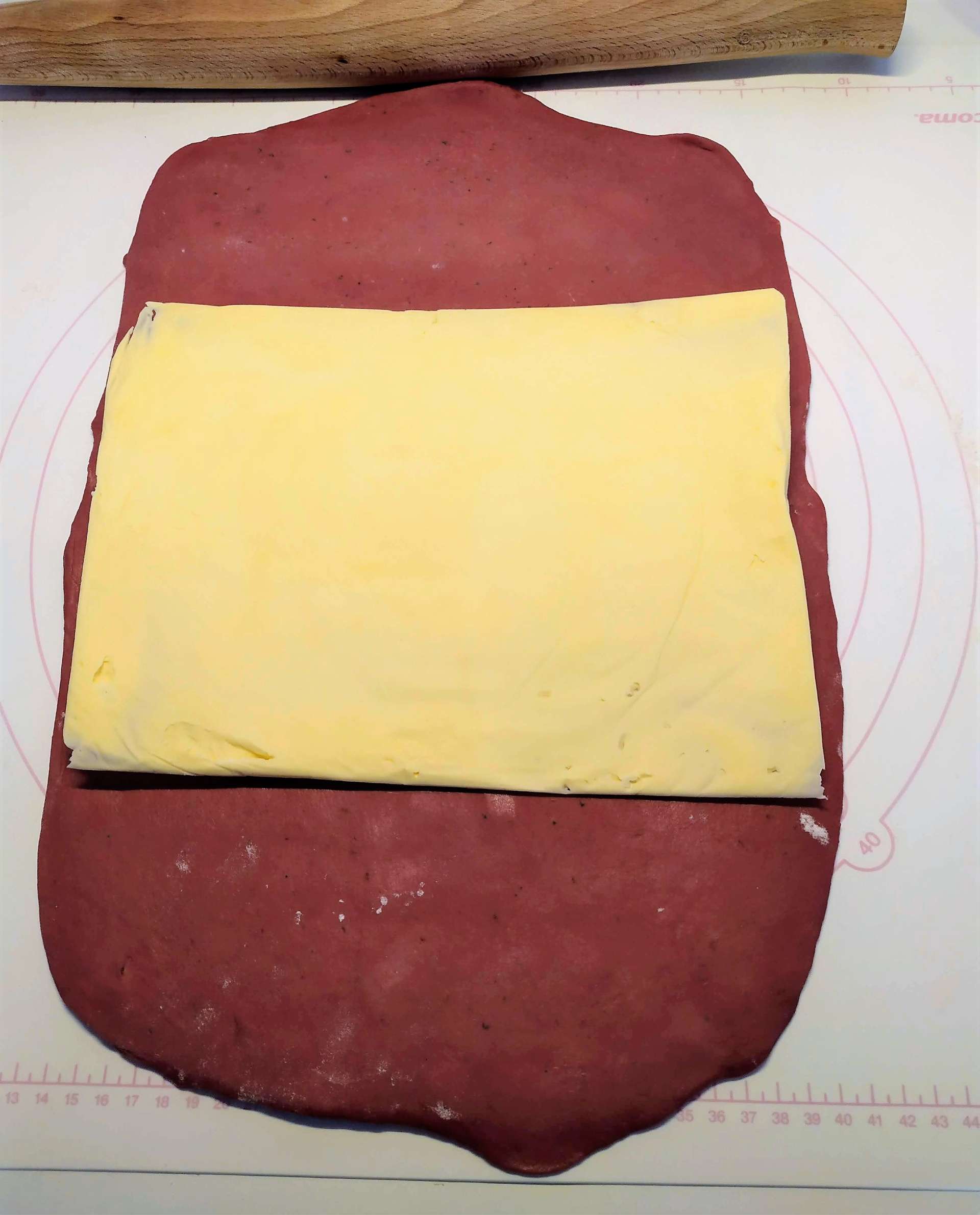 - Colocamos la placa de mantequilla en el centro, como el ancho coincide, cerramos plegando los costados. Sellamos bien el centro y los laterales, para que la mantequilla quede dentro.