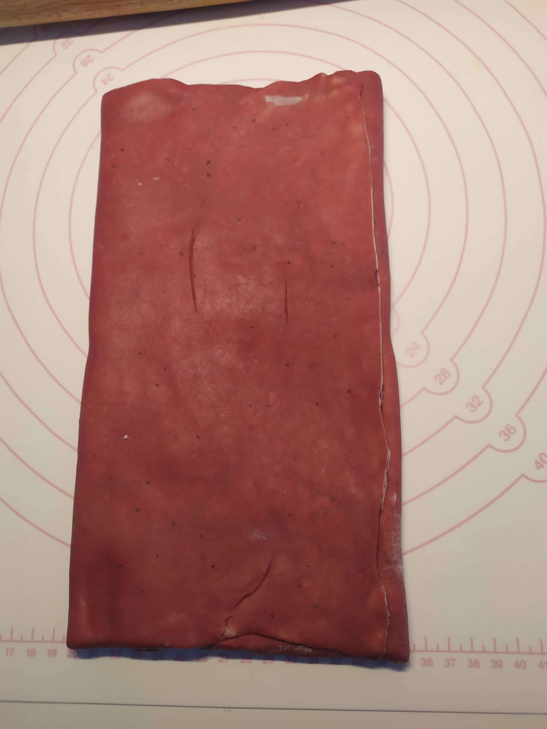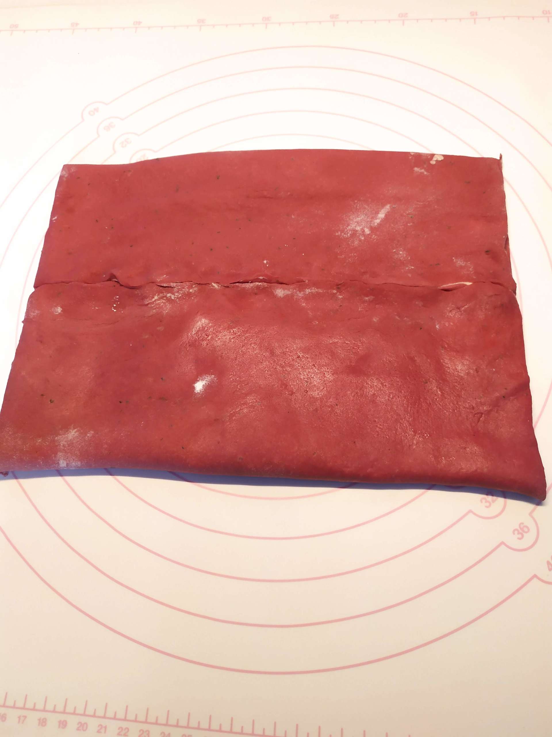 - Plegamos en forma de tríptico, pasamos suavemente el rodillo para igualar, cubrimos con film y llevamos al frigo durante 30 minutos.