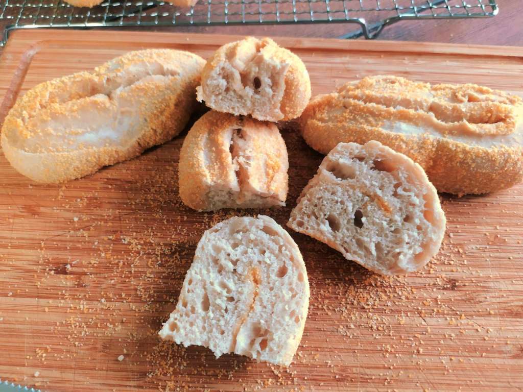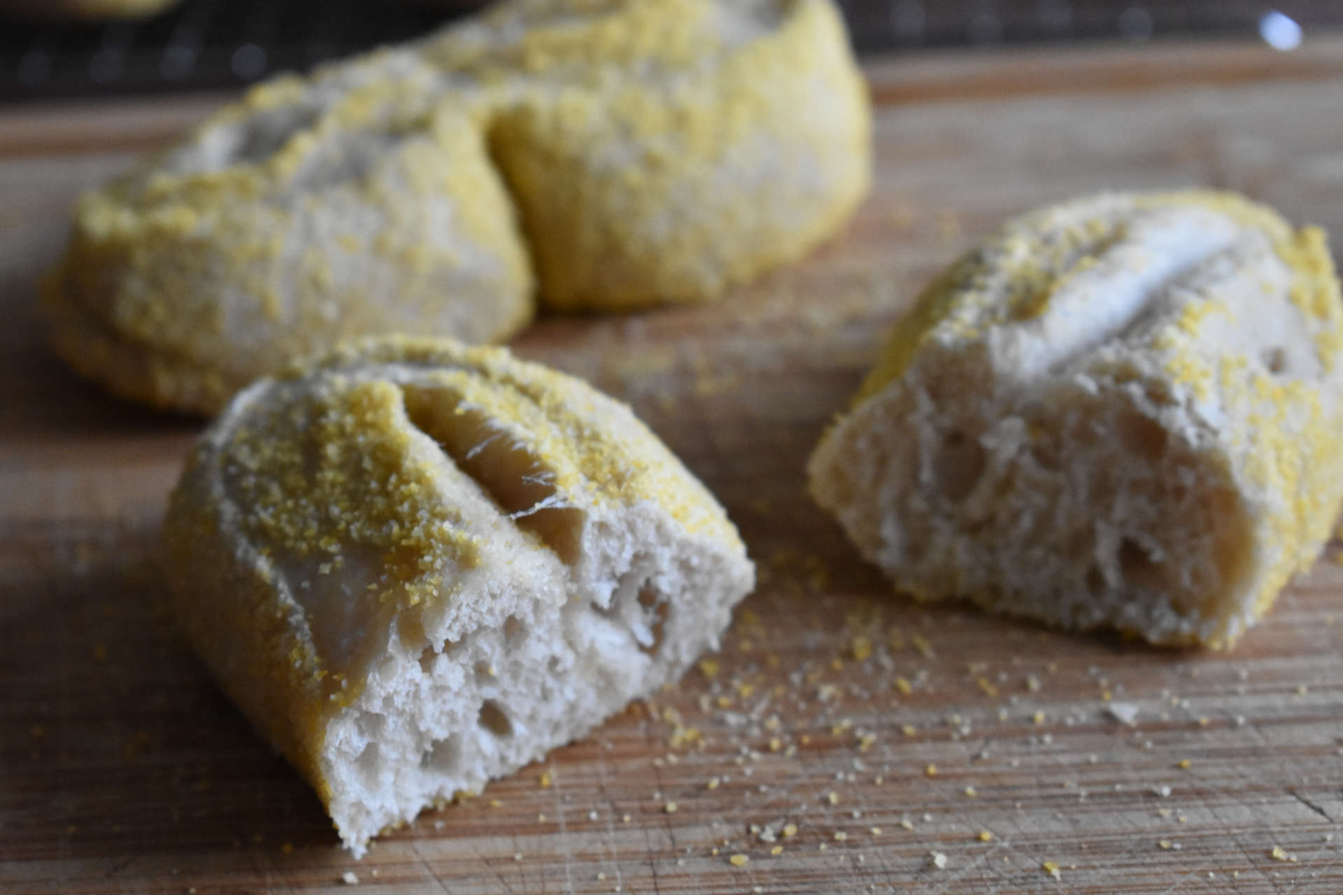Este pan con acento francés es típico de Uruguay. Podemos encontrar en cualquier panadería y es fiel compañero de meriendas y bocadillos para acompañar con nuestra bebida nacional: el mate. Lo que lo diferencia de otros panes es la forma de armarlo y su costra de harina de maíz. Hoy les traigo la receta hecha con masa madre, lo que lo hará más tierno y saludable. Si no tienes masa madre puedes usar levadura aunque se notará la diferencia. Te invito a probarlo. En mi caso, para que tenga algo francés he usado harina T65 de la misma Francia. Pero te servirá cualquier harina panadera.