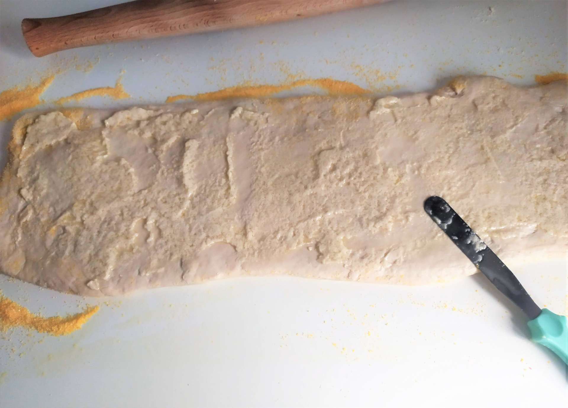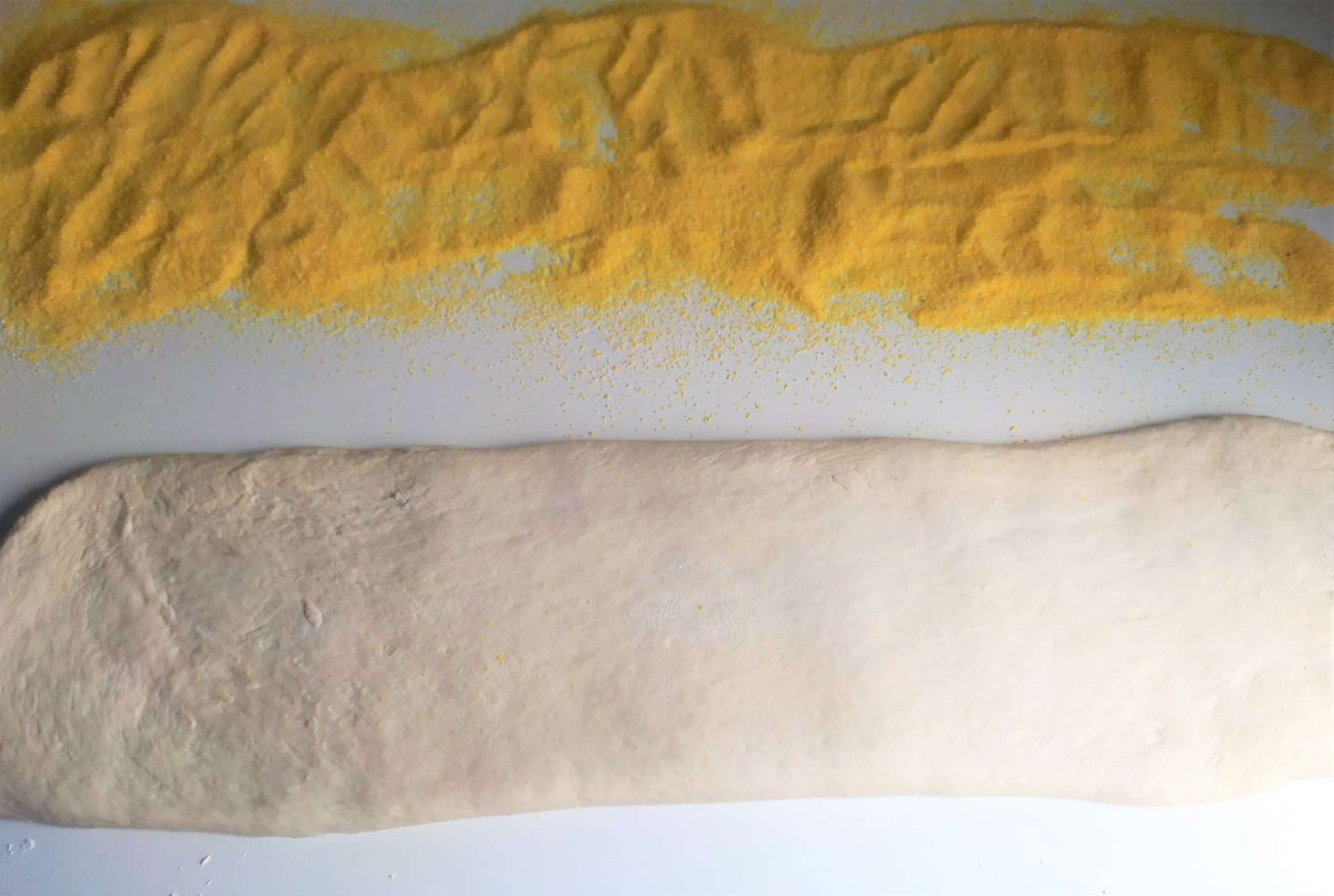 - Volvemos a estirar la masa hasta un espesor de unos 3 cm, formando un rectángulo de 25 a 30 cm de ancho. Pincelamos con un poquito de aceite la superficie y la volcamos de ese lado y con cuidado sobre la harina de maíz para que esta se impregne. Pincelamos la superficie superior, sin harina de maíz, con la mistela y doblamos sobre sí misma, a lo largo. Tapamos y dejamos leudar hasta que doble volumen.