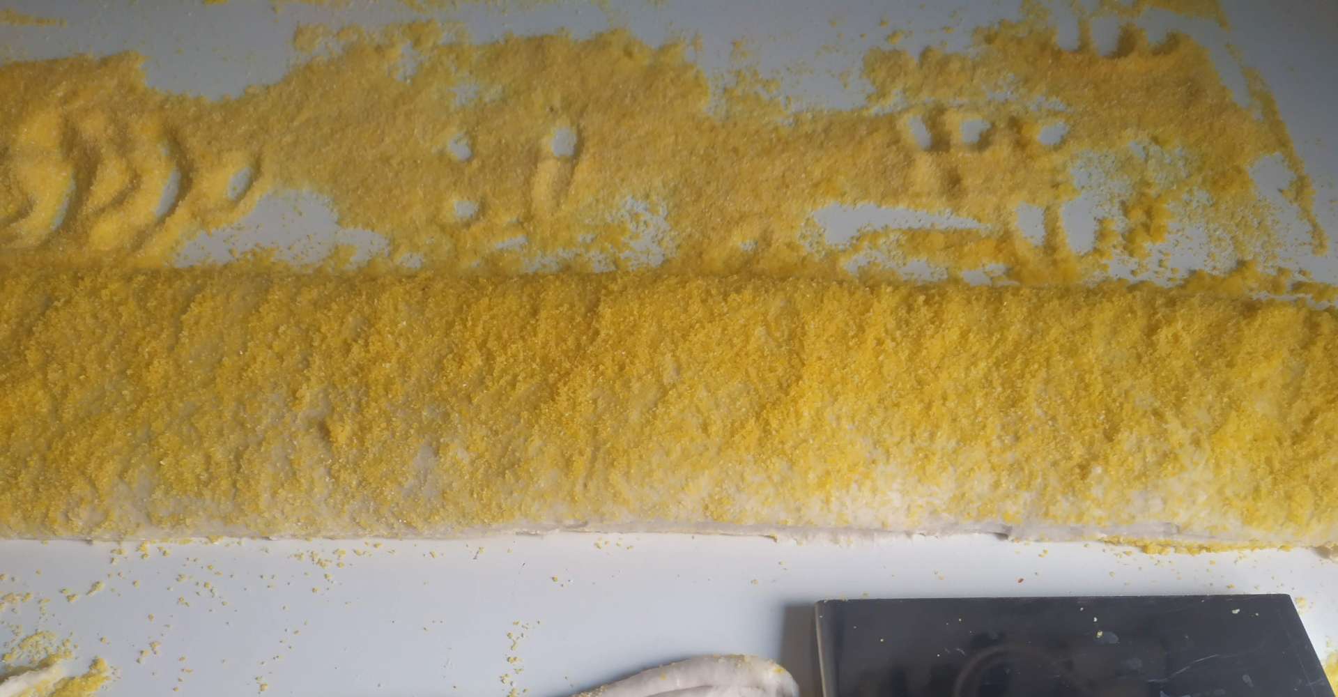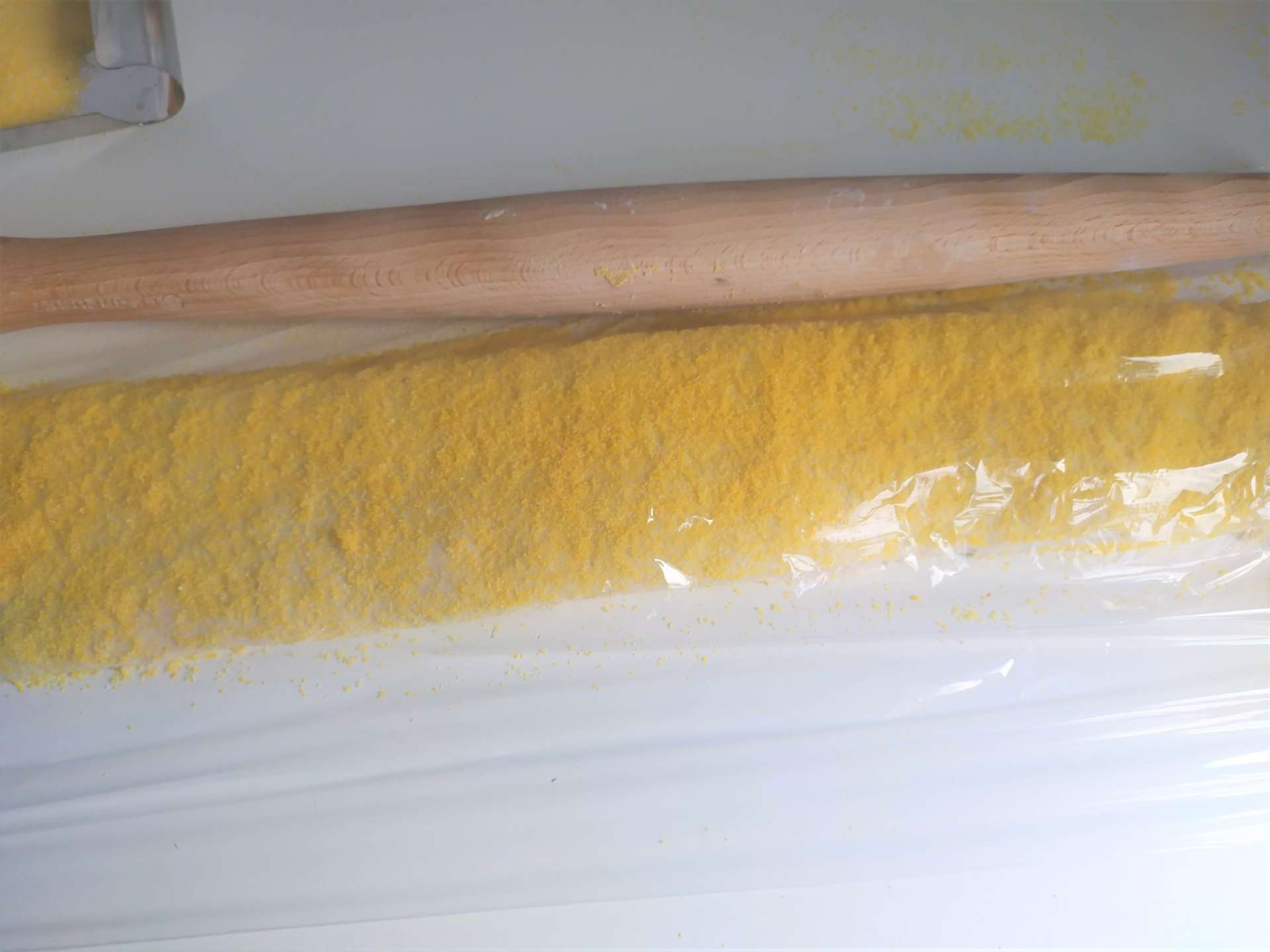- Ponemos harina de maíz sobre la mesada a todo lo largo a un costado de la masa.