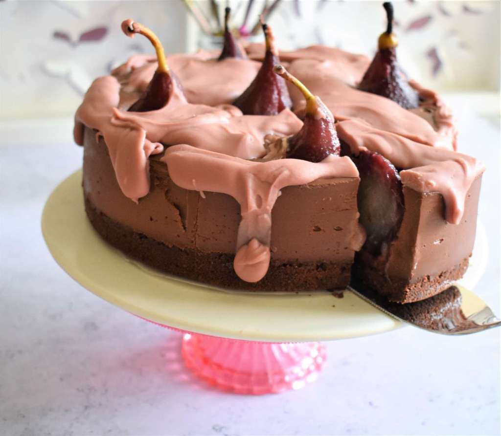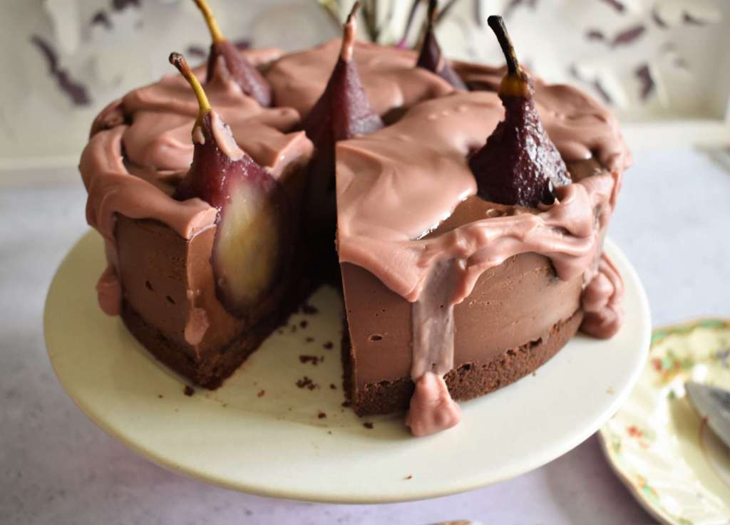 A veces por la noche miro videos de recetas hasta que me quedo dormida. Al tiempo, y dependiendo de la temporada y mi nevera, se me representa alguna pero no recuerdo exactamente donde la vi. Eso me pasó con esta tarta. Como no encontré la página original, hice mi versión. Queda exquisitamente bella y la combinación de chocolate, peras y vino especiado no te defraudará.