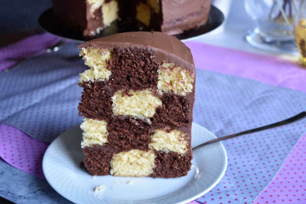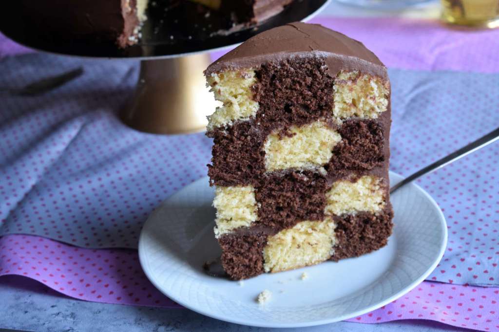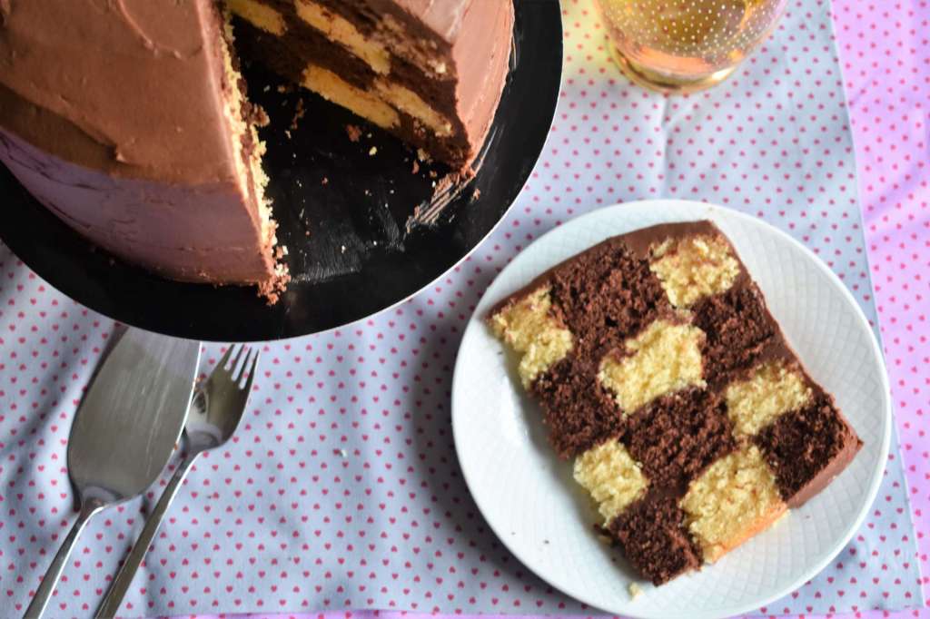 - 10. Horneamos unos 30-40 minutos, hasta que los bizcochos pasen la prueba del palillo. Puedes hornear en 2 tandas si los bizcochos no entran en tu horno. Otra opción es hacer cada masa en un molde y luego partirlos, pero no quedará tan perfecto del damero. Si haces un bizcocho de cada, llevará más tiempo de horneado. Recuerda no abrir el horno nunca antes de 20 minutos.