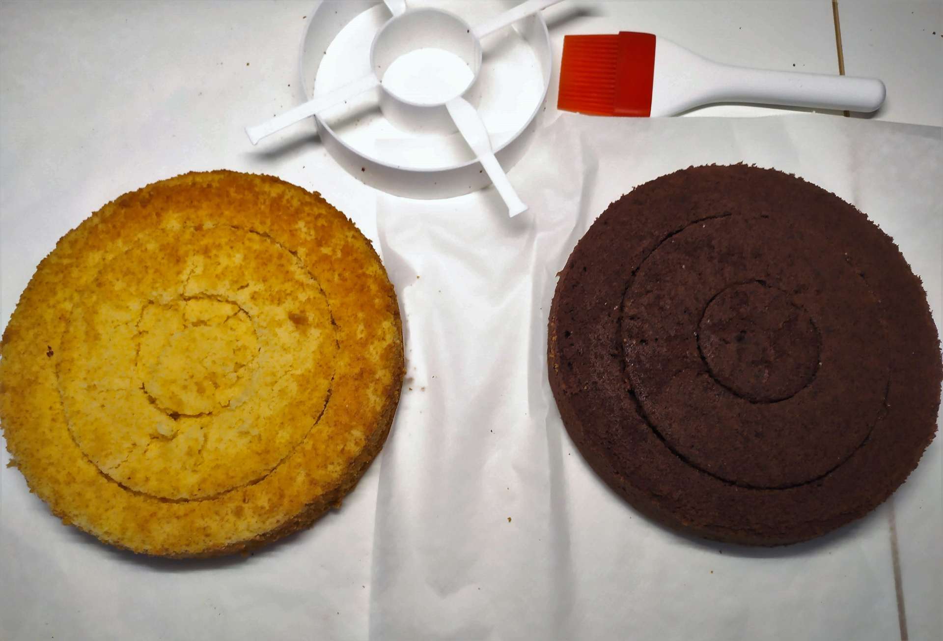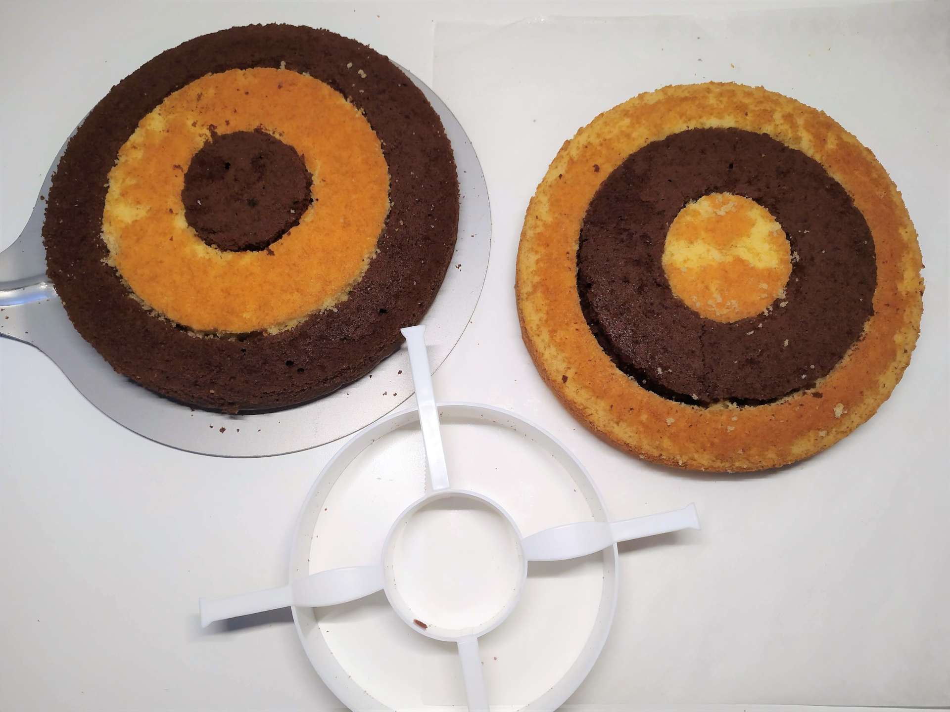 - 14. Cortamos dos anillos sobre cada una de las cuatro capas de bizcocho con cortadores de galletas, de modo que queden 3 anillos por cada uno. Vamos intercambiando los anillos que acabamos de cortar, de manera que al final tengamos cuatro piezas con tres anillos con ambos colores. (Ver foto). En 2 predomina el chocolate y en 2 los anillos de naranja.
