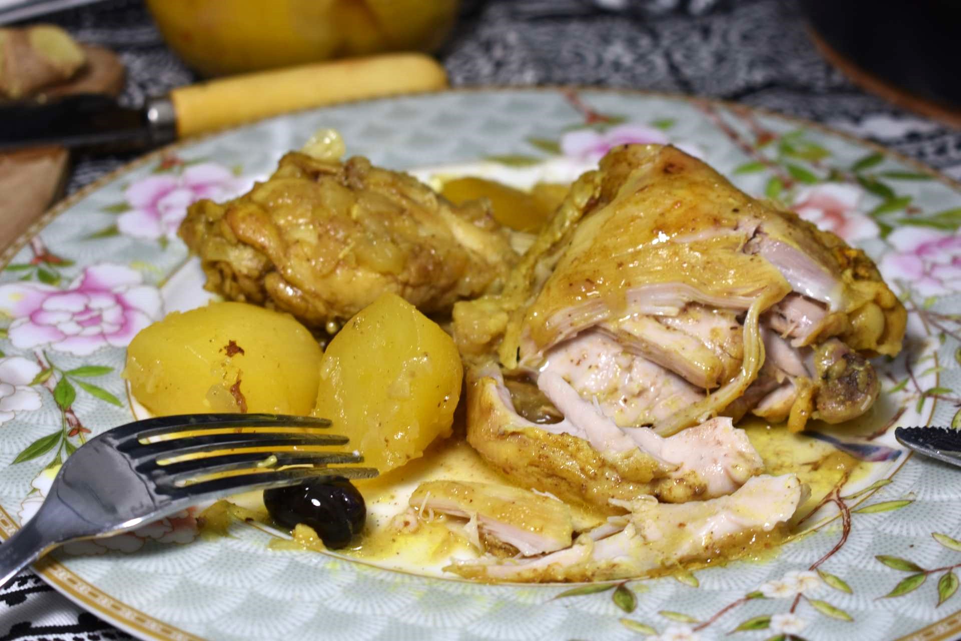 - Coloca las patatas, los cuartos de limón confitado y las aceitunas sobre el pollo.